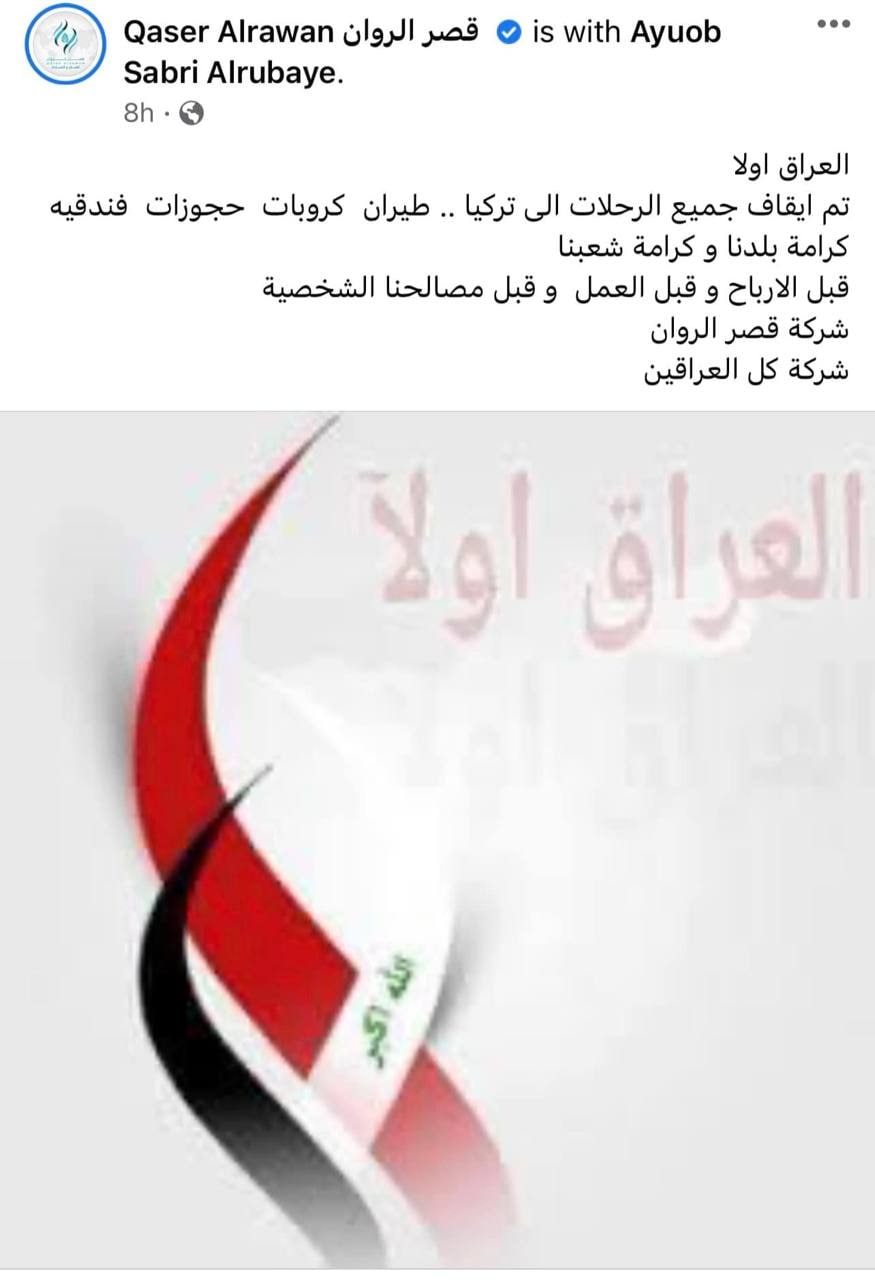 وذكرت الشركات، في منشورات لها على الـ”فيسبوك”، واطلعت عليها “النعيم نيوز”، أنه “تم إيقاف جميع الرحلات إلى تركيا.. طيران، كروبات، حجوزات فندقية”، مضيفة أنها “تعلن مقاطعتها جميع قطع التذاكر والرحلات إلى تركيا”.