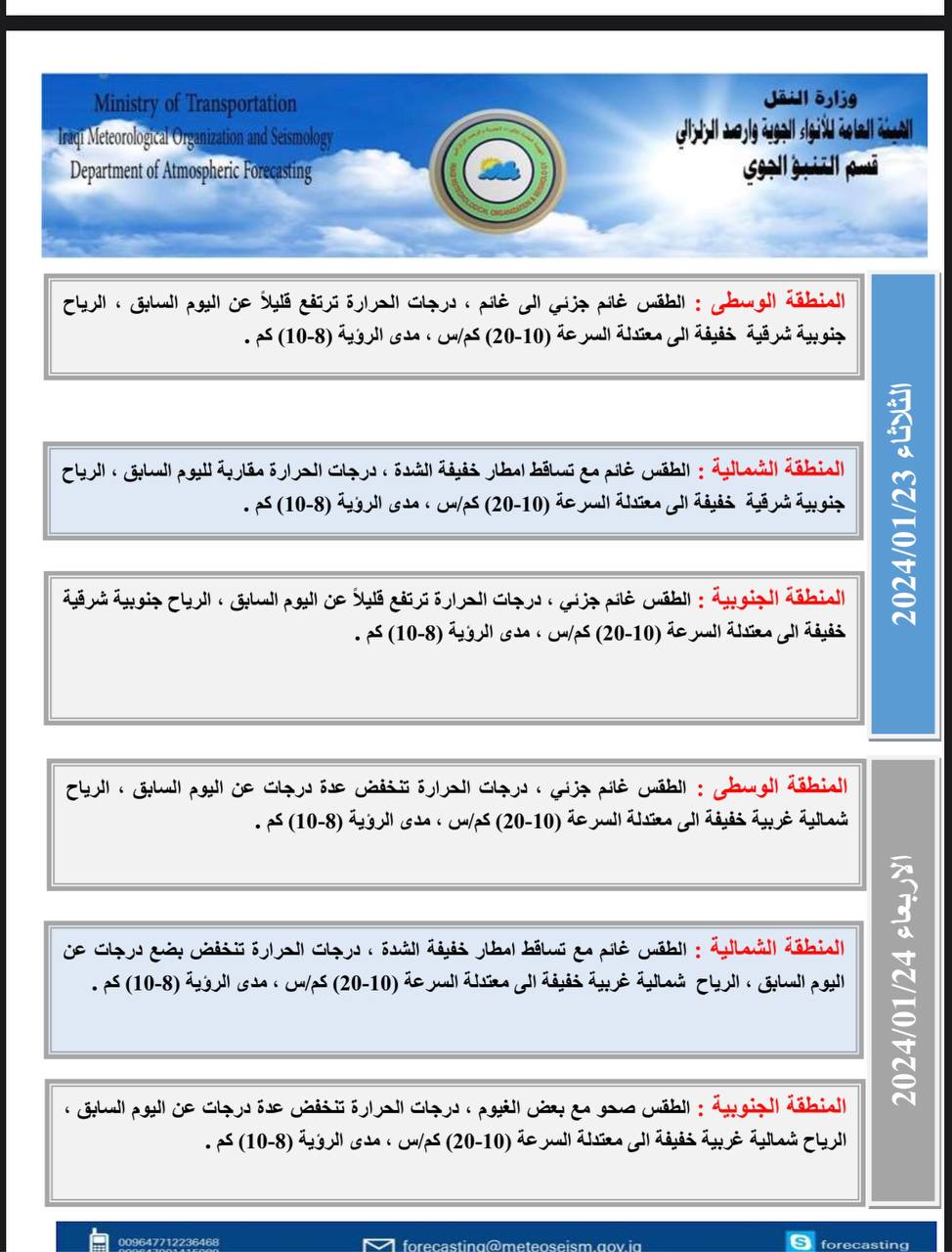 وأشار، إلى أن “توقعات الحالة الجوية ليوم الأربعاء المقبل، سيكون الطقس غائماً جزئياً في المنطقة الوسطى. وغائماً مع تساقط أمطار خفيفة الشدة في المنطقة الشمالية، وسيكون صحواً مع بعض الغيوم. في المنطقة الجنوبية، ودرجات الحرارة تنخفض عدة درجات عن اليوم السابق. في جميع مناطق البلاد”.