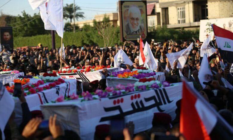وتابع”وقد انطلق موكب التشييع المهيب للجثامين الطاهرة للشهداء السعداء في منطقة شارع فلسطين وسط بغداد وسط تنديدات بالقصف الأميركي الغادر الذي مثل انتهاكا سافرا للسيادة العراقية”.