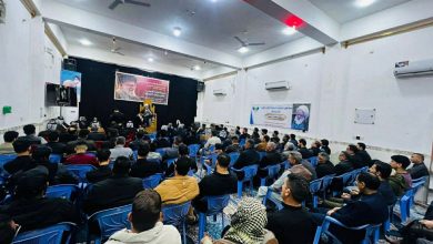 وأضاف، “ثم ألقى الاستاذ احمد البديري محاضرة بعنوان (الشهيد القائد الخامنائي .. دروس من سيرته ومسيرته القيادية الرسالية)، أشار خلالها إلى اهم محطات العمل الرسالي للفقيد الشهيد وملامح من الأدوار المهمة لهذه القيادة الرسالية خلال ستون عاما من الجهاد والعطاء والمسؤولية التي كان لها تأثير كبير في تاريخ الجمهورية الإسلامية والعالم الإسلامي والإنسانية جمعاء”.