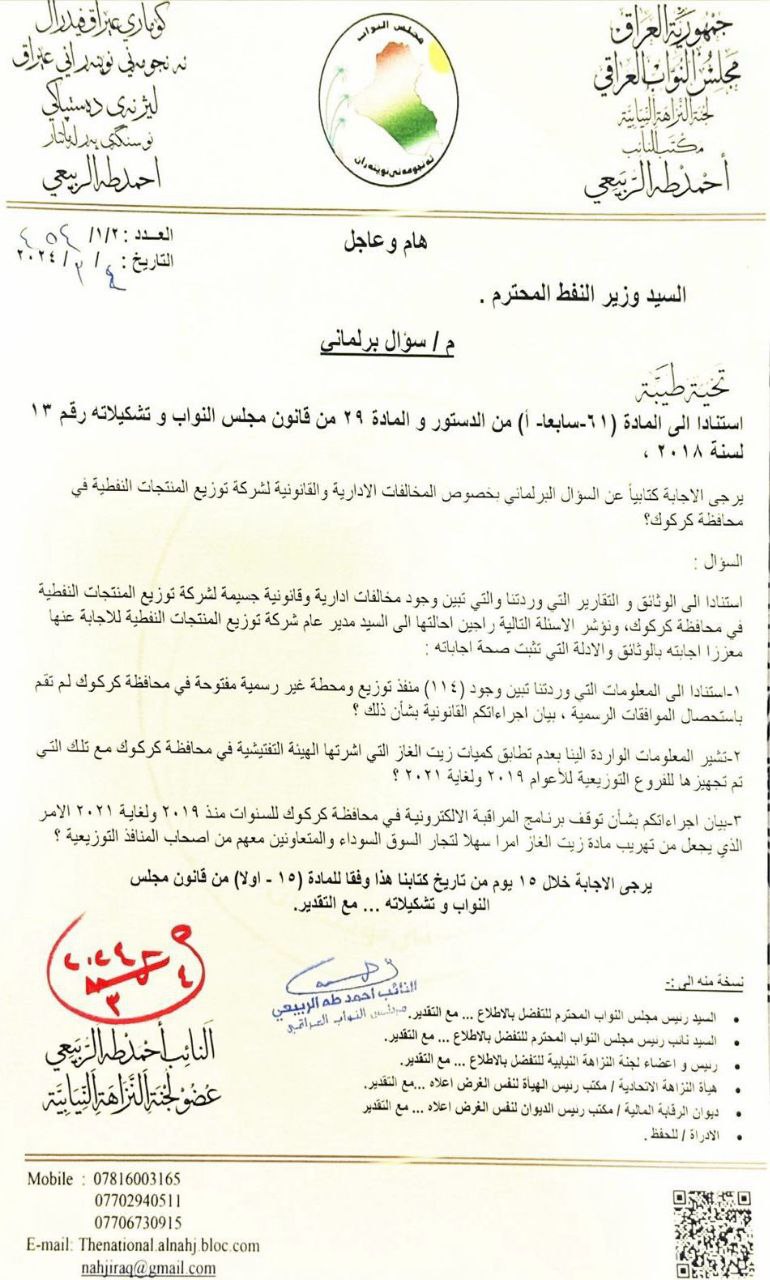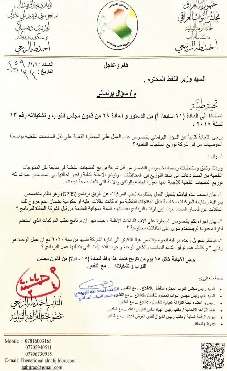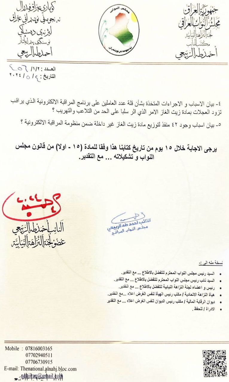 كشف عضو لجنة النزاهة النيابية احمد طه الربيعي، اليوم الخميس، عن عشرات المخالفات الإدارية وشبهات الفساد في شركة توزيع المنتجات النفطية. وفيما يلي الوثائق، تلقت "النعيم نيوز" نسخة منهم