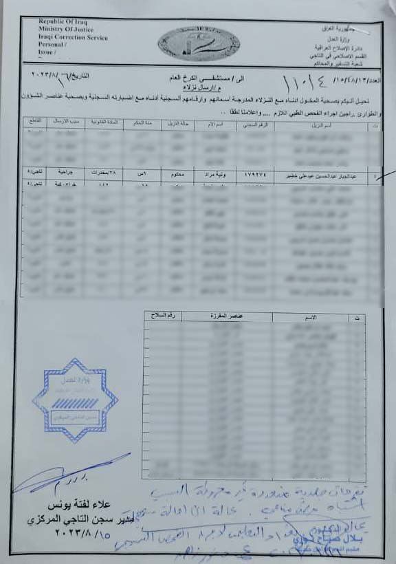 وتابع، أن “السجين أرسل مرات عديدة للمستشفيات لغرض تلقي العلاج وفقاً للتقارير الطبية والإحالات، وقد أبدت الكوادر الطبية التابعة إلى وزارة الصحة جهداً استثنائياً في سبيل علاج النزيل، لغرض تحسين حالته الصحية واستجابته للعلاج”.