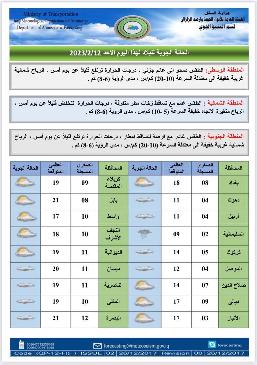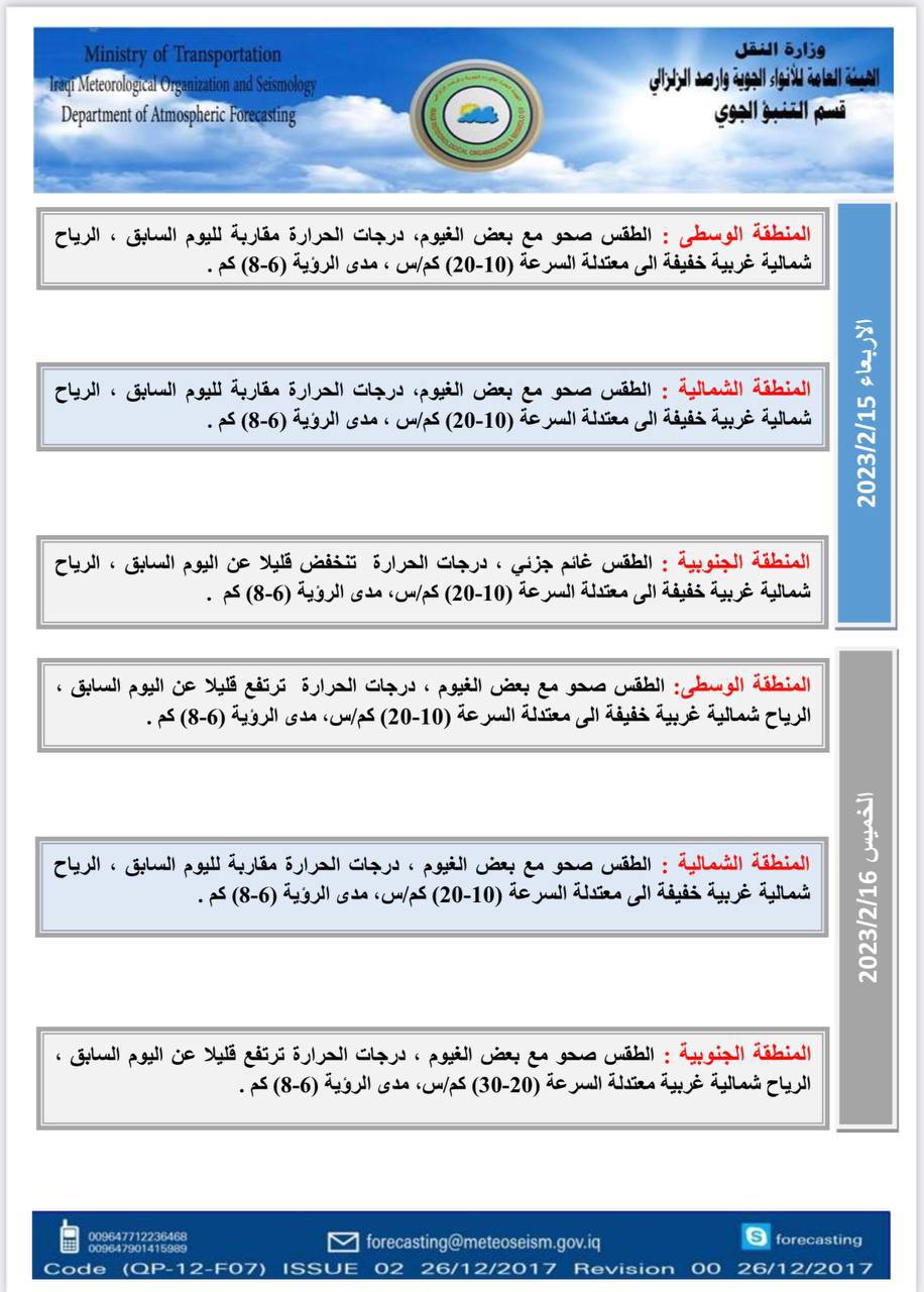 ونوه، إلى أن “طقس البلاد ليوم الخميس المقبل سيكون صحواً مع بعض الغيوم في جميع مناطق البلاد. أما درجات الحرارة فسترتفع قليلاً عن اليوم السابق في الأقسام الوسطى والجنوبية. وتكون مقاربة لليوم السابق في القسم الشمالي من البلاد”.