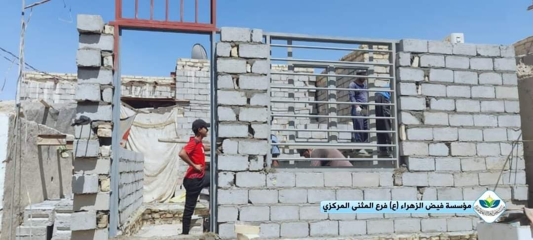 برعاية مكتب سماحة المرجع الديني الشيخ محمد اليعقوبي مؤسسة فيض الزهراء (ع) لرعاية الإيتام والفقراء فرع المثنى تقوم ببناء بيت لإحدى العوائل الفقيرة والمتعففة تسكن في غرفة من طين وحديد في مدينة السماوة.