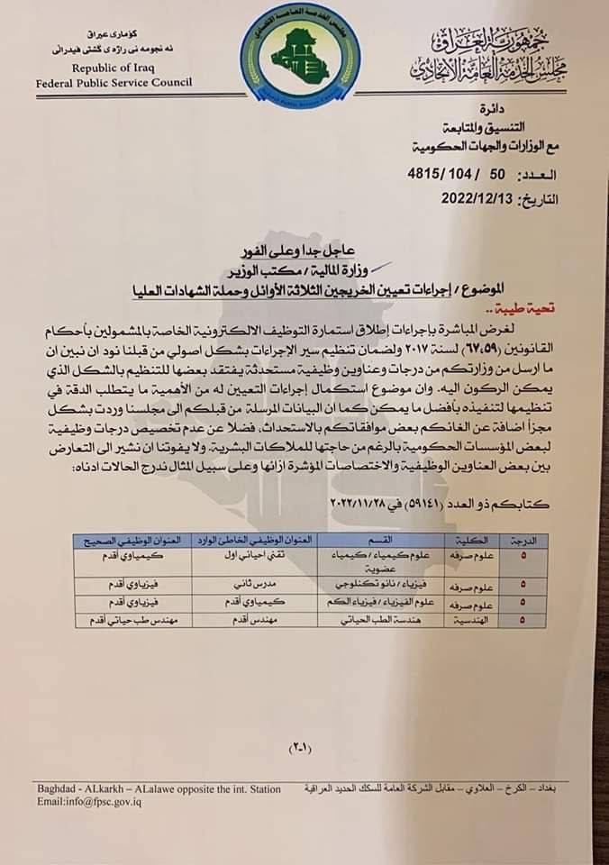 خاطب مجلس الخدمة الاتحادي، اليوم الأربعاء، وزارة المالية، بخصوص إجراءات تعيين الخريجين الثلاثة الأوائل، وحملة الشهادات العليا.