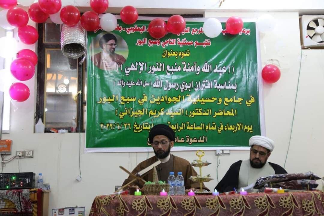 وذكرت الممثلية، في بيان تلقت “النعيم نيوز” نسخة منه، أن “الندوة الفكرية أقيمت بعنوان (عبدالله وآمنة منبع النور الإلهي) في حسينية الجوادين – سبع البور، وبحضور الدكتور السيد عبدالكريم الجيزاني، ومجموعة من فضلاء الحوزة العلمية وعدد من المؤمنين”.