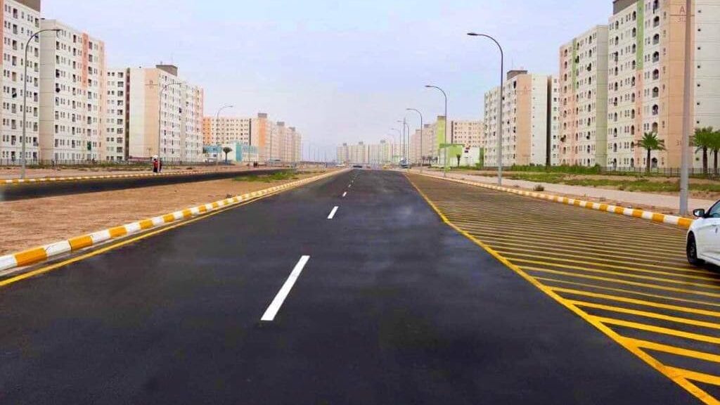 وأوضح حمادة، أن “هذا المدخل بطول (235 متراً) وعرض (50 متراً) يربط شارع بغداد – الكوت الرئيسي بالمدينة السكنية ويقع بين مجمعي (A,B). وقد تم تنفيذه من قبل شركة هانوا الكورية الجنوبية المنفذة للمشروع مع الأرصفة على جانبي الطريق”.