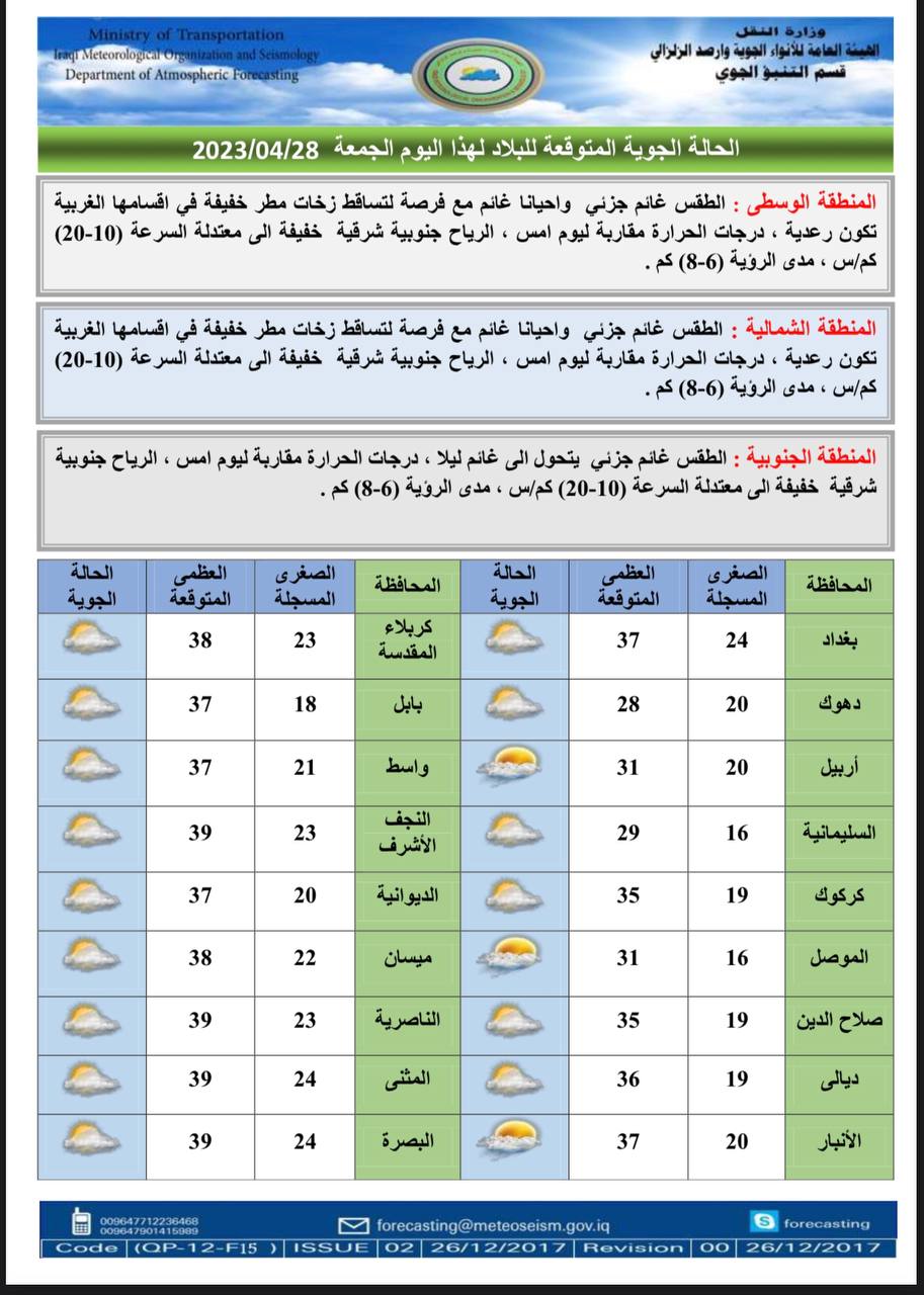 أعلنت هيئة الأنواء الجوية، اليوم الجمعة، عن حالة الطقس في البلاد للأيام المقبلة، فيما توقعت تساقطاً للأمطار وتصاعداً للغبار وانخفاضاً في درجات الحرارة.