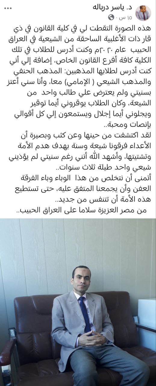 وقال درباله، في منشور على حسابه في موقع “فيسبوك”: “كنت أدرس للطلاب في الكلية كافة أفرع القانون الخاص، إضافة إلى تدريس لطلابها المذهبين: الحنفي والشيعي (الإمامي) معاً”، مضيفاً: “إني سني وأعتز بسنيتي، ولم يعترض علي طالب واحد من الشيعة، بل كان الطلاب يوقروني أيما توقير ويجلوني أيما إجلال ويستمعون إلي كل أقوالي بإنصات ومحبة”.