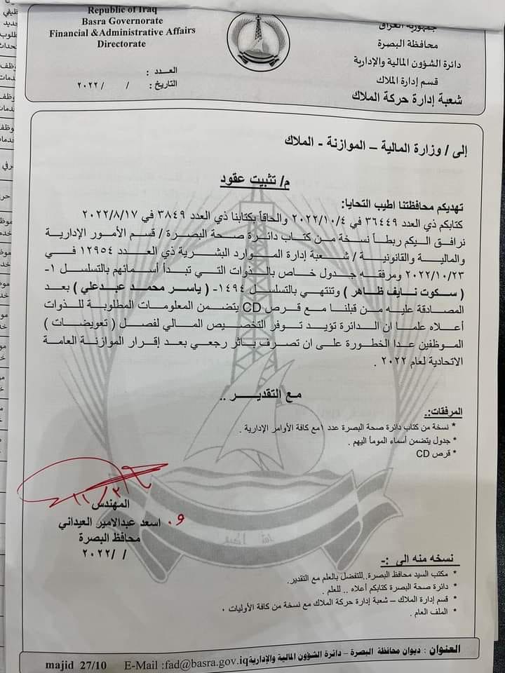 ولفت، إلى “مصادقة النائب الأول للمحافظ، على كتاب مديرية بلديات البصرة حول مرتسم إفراز القطعة الواقعة في منطقة البيبان العائدة إلى بلدية شط العرب، والواقعة داخل التصميم الأساسي إلى موظفي دائرة الصحة”.
