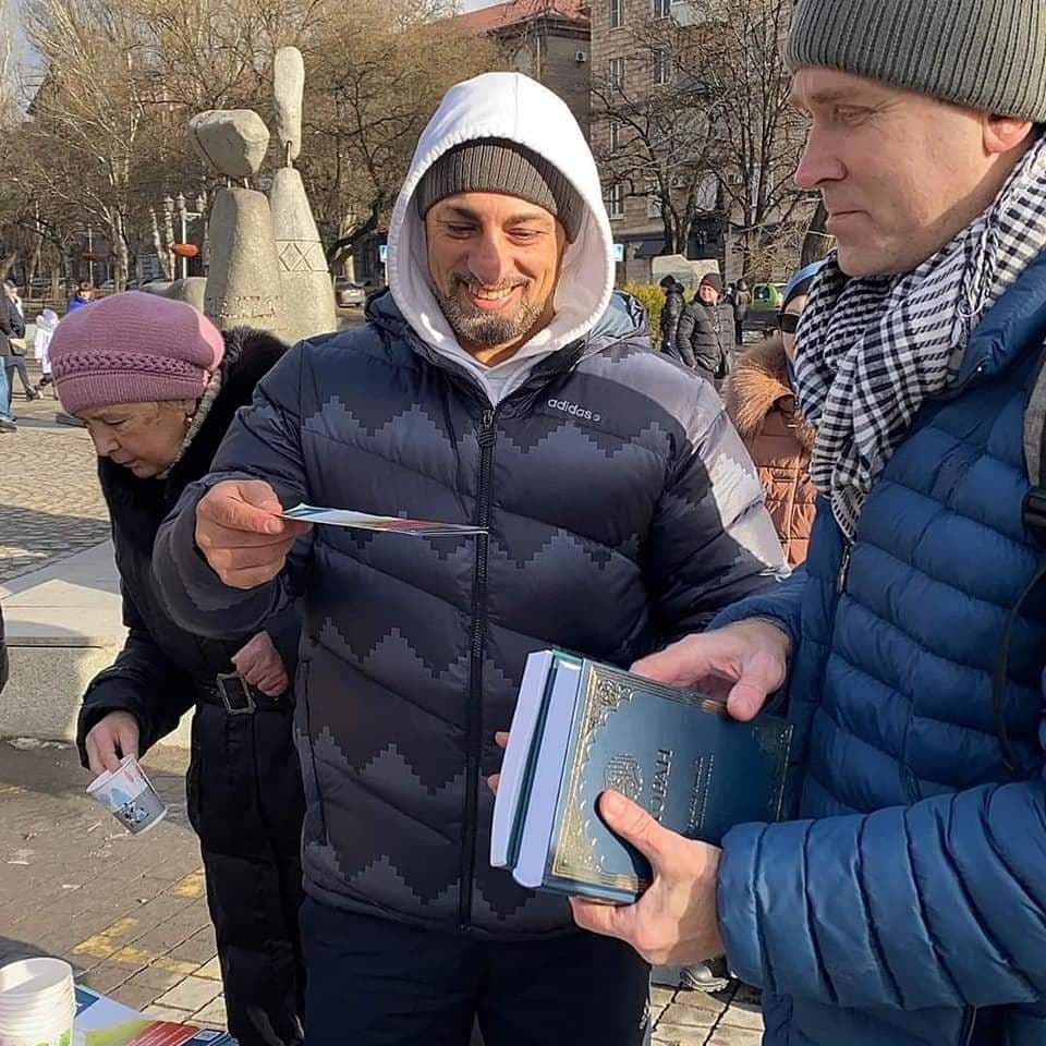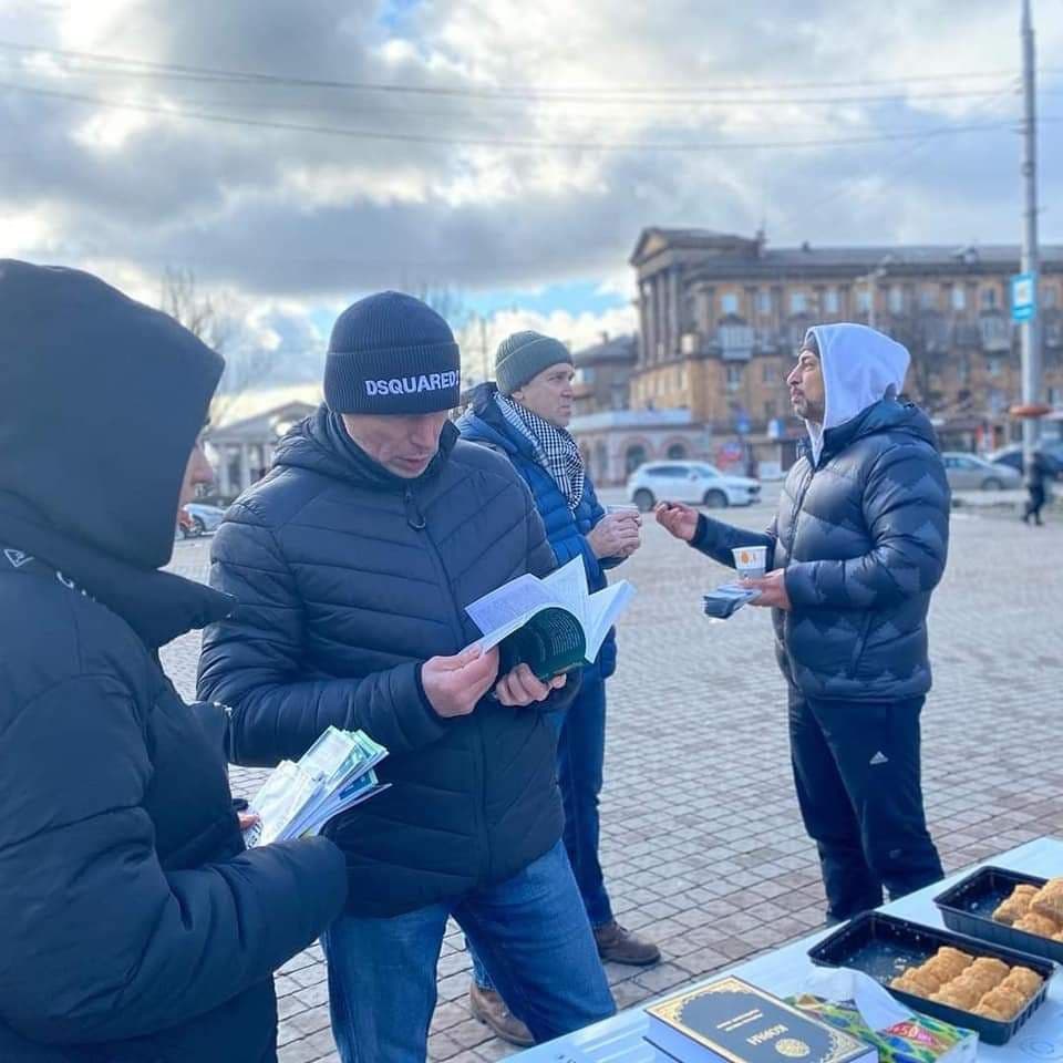 وأكدت تقارير صحفية، اطلعت عليها “النعيم نيوز”، أنه “حل ضيفاً الشيخ طارق سرحان “مسؤول قسم الدعوة والتعريف في المركز الثقافي الإسلامي بالعاصمة كييف”، ليجيب على استفسارات وتساؤلات المارة حول الإسلام والمسلمين“.