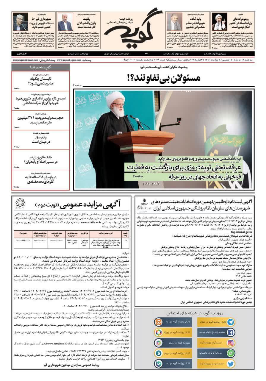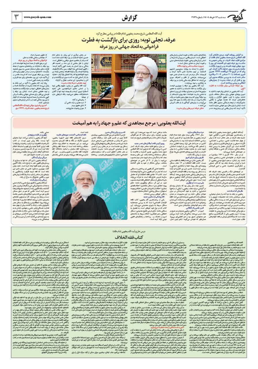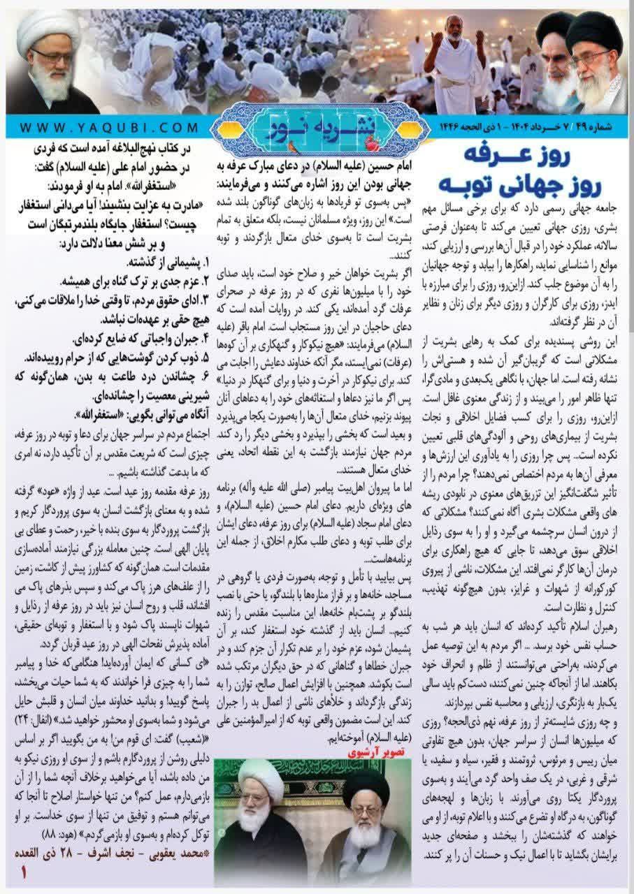 وتابع البيان، أنه “في الصفحة الأولى من هذا العدد، تم تناول موضوع (يوم عرفة …. اليوم العالمي للتوبة) وهو بيان سماحة المرجع آية الله العظمى الشيخ محمد اليعقوبي (دام ظله) بمناسبة يوم عرفة (التاسع من ذي الحجة)، حيث أطلق عليه تسمية (اليوم العالمي للتوبة)، مؤكداً على ضرورة عودة المجتمع البشري إلى الله تعالى. وقد صدر هذا البيان في 28 ذي القعدة 1427 هـ (الموافق 20 ديسمبر 2006م)، وتناول المكانة الروحية لهذا اليوم، ودوره في إنقاذ البشرية من الأزمات الأخلاقية والنفسية”.