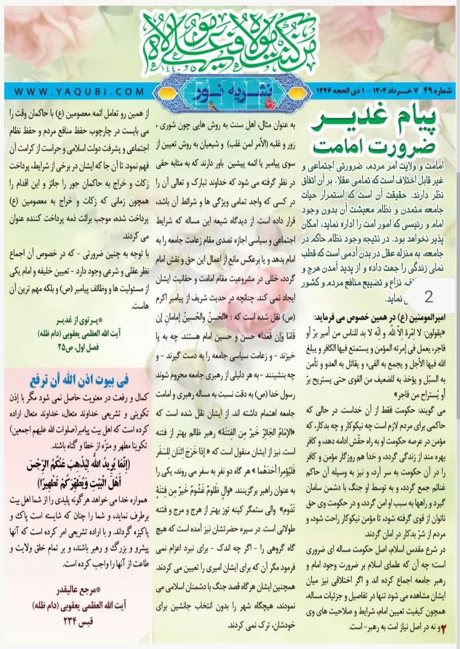 وذكر بيان للمؤسسة، تلقت “النعيم نيوز” نسخة منه، أن “مؤسسة نور للترجمة والتحقيق، تحت إشراف مكتب سماحة المرجع الديني آية الله العظمى الشيخ محمد اليعقوبي (دام ظله) في قم المقدسة، تم نشر العدد 49 من نشرة (نور) باللغة الفارسية”.