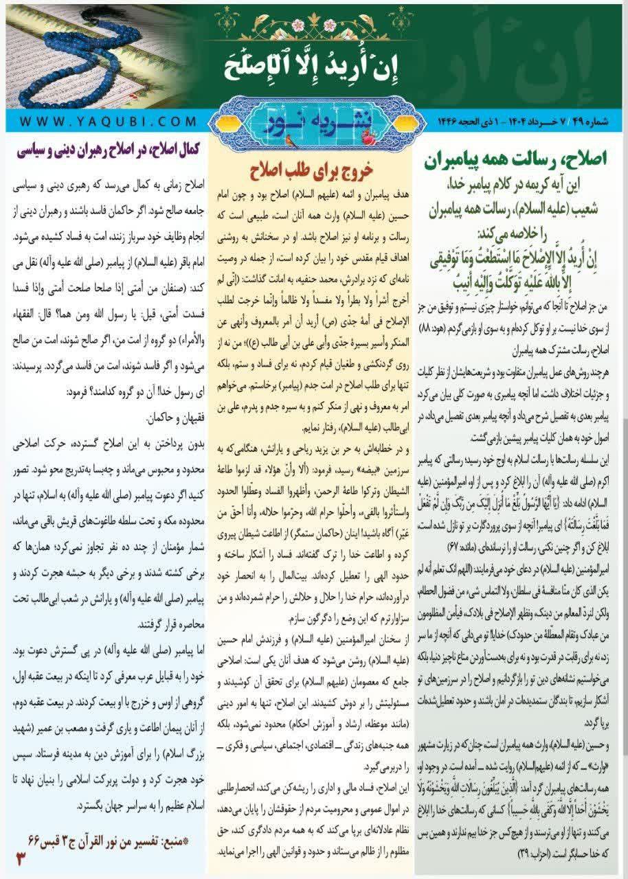 وأشار البيان، إلى أن “الصفحة الثالثة من النشرة بتبيين آیة {إِنْ أُرِيدُ إِلاَّ الإِصْلاَحَ مَا اسْتَطَعْتُ وَمَا تَوْفِيقِي إِلاَّ بِاللّهِ عَلَيْهِ تَوَكَّلْتُ وَإِلَيْهِ أُنِيبُ} من سورة هود الآية 88 من تفسير من نور القرآن لسماحة المرجع، تحت عنوان (الإصلاح رسالة الأنبياء)”.