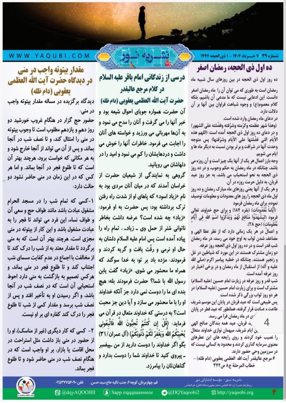 وأوضح، أن “الصفحة الأخيرة من النشرة فتعرض رأي سماحة المرجع، حول مقدار الواجب من البيتوتة في منى في مناسك الحج، وأیضاً تبيين مكانة العشر الأول من ذي الحجة التي سميّت برمضان الأصغر علی لسان سماحة المرجع، وفق الأدلة الروائية التي تمسك بها في هذه التسمية، وأیضاً إشارة إلی درس من سيرة الإمام الباقر (ع) في خطابات سماحته (دام ظله)”.
