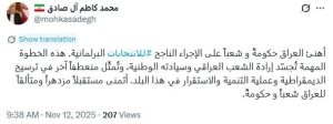 وقال السفير محمد آل صادق في منشور عبر حسابه الرسمي بموقع “إكس”، تابعته “النعيم نيوز”: “نهنئ العراق، حكومةً وشعبًا، على إجراء الانتخابات البرلمانية بنجاح”.