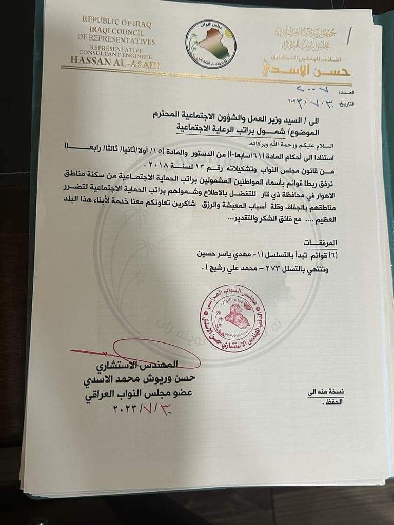 الأسدي يستحصل موافقة وزير العمل على شمول أعداد جديدة براتب الحماية الاجتماعية