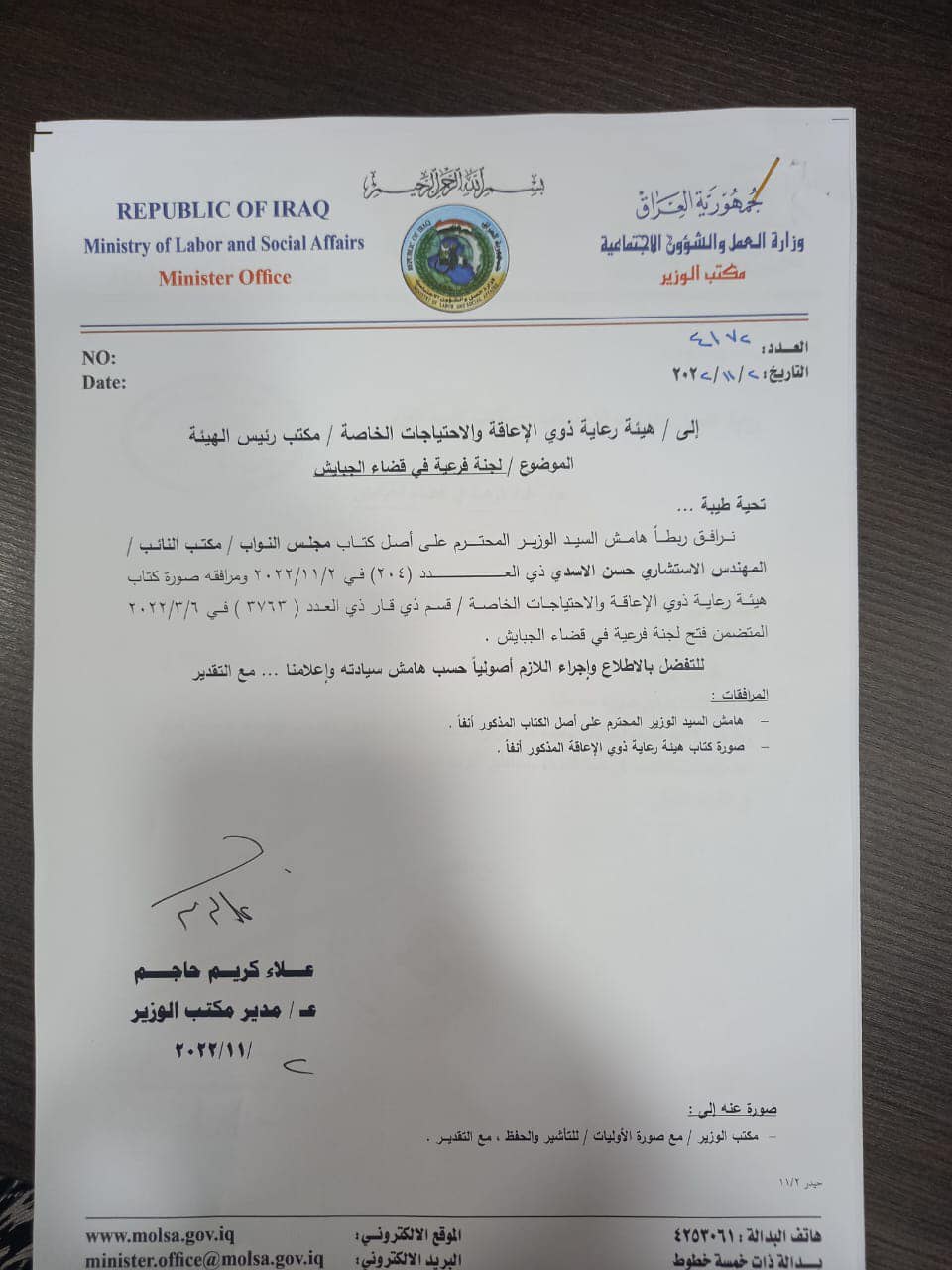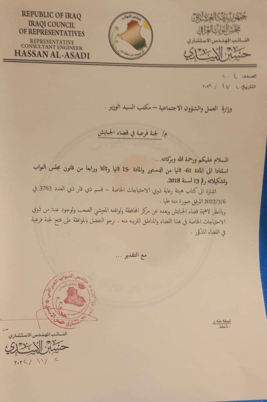 وأشار، إلى أنه “بالنظر لما تعانيه شريحة ذوي الإعاقة من بعد المسافة عن مركز المحافظة، فقد استحصل النائب موافقة وزير العمل والشؤون الاجتماعية، على فتح لجنة فرعية في قضاء الجبايش، لتسهيل إجراءات هذه الشريحة المهمة”.