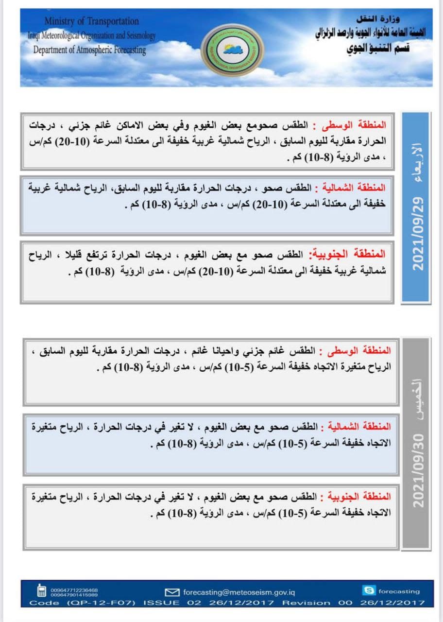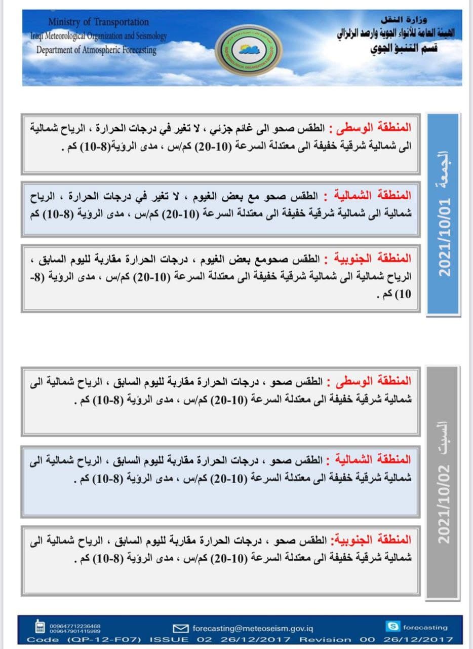 وأشار أيضا إلى أن “طقس يومي الجمعة والسبت المقبلين سيكون صحواً مع بعض الغيوم، مكا أنه لا تغير في درجات الحرارة”. موضحاً أن “الرياح ستكون شمالية إلى شمالية شرقية خفيفة إلى معتدلة السرعة (10-20) كم/س في جميع انحاء البلاد”.