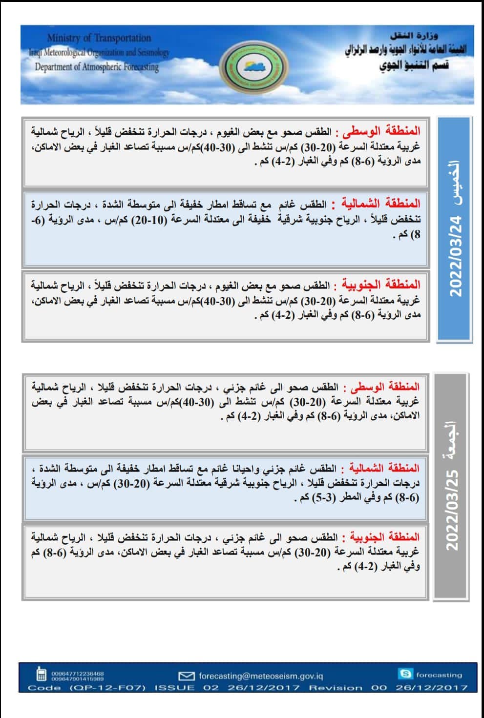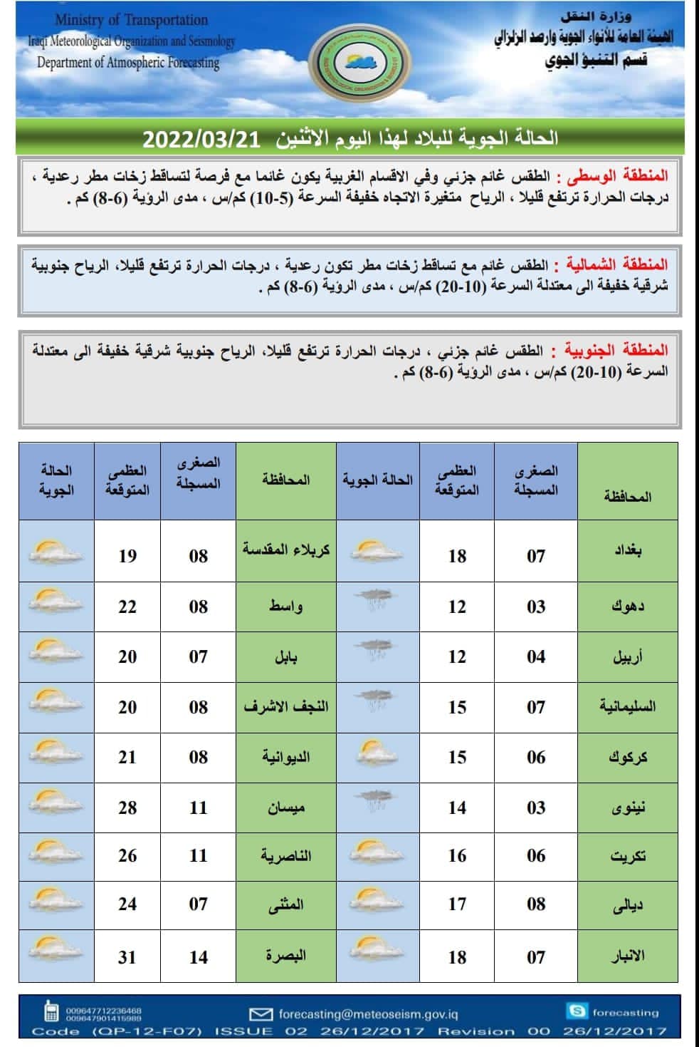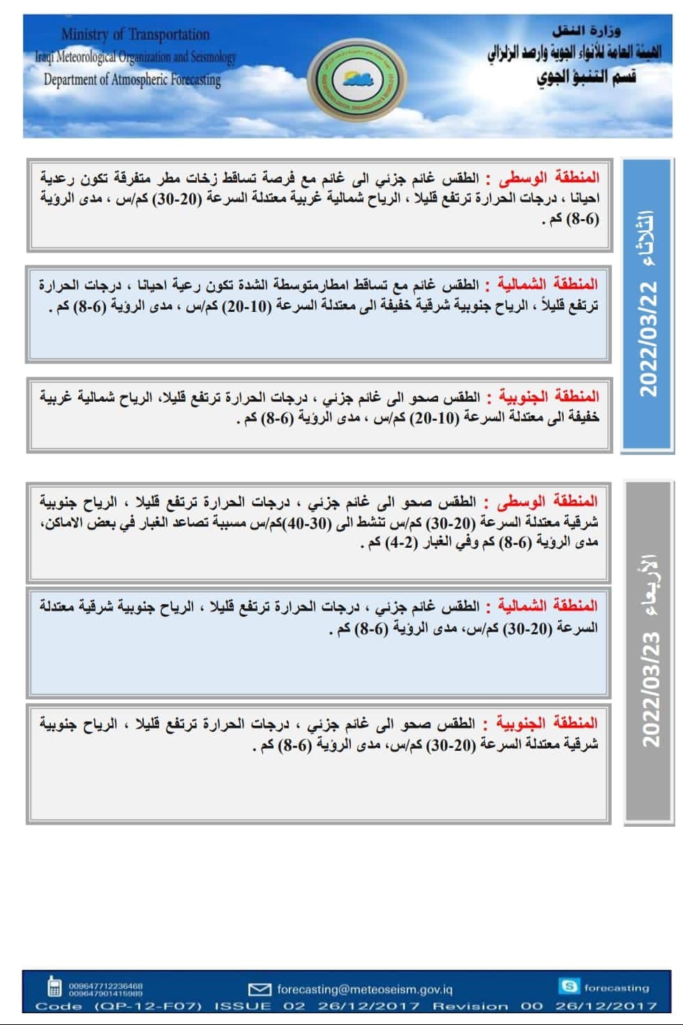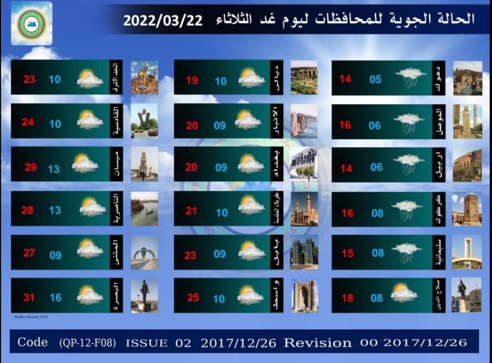 وتابعت، “بينما سيكون طقس المنطقة الشمالية غائماً مع تساقط أمطار متوسطة الشدة تكون رعدية احياناً، فيما سيكون طقس المنطقة الجنوبية صحواً إلى غائم جزئي، ودرجات الحرارة سترتفع قليلاً بعموم البلاد”.