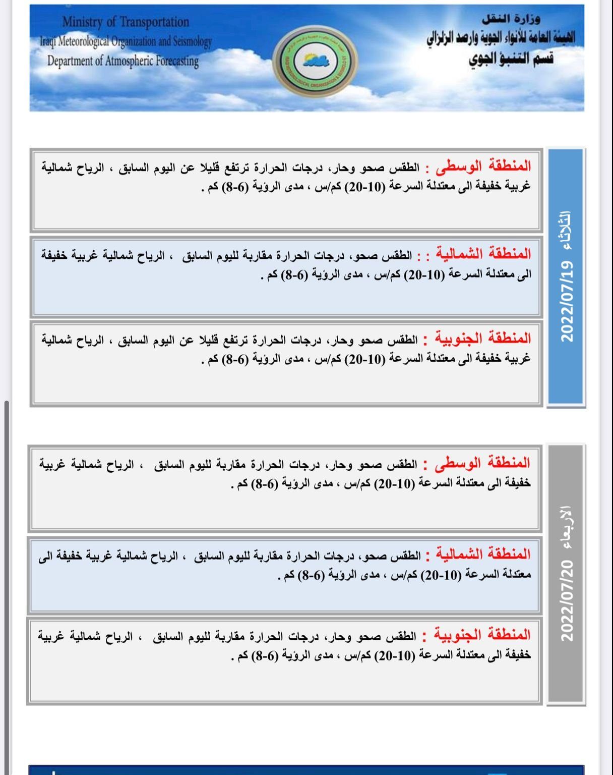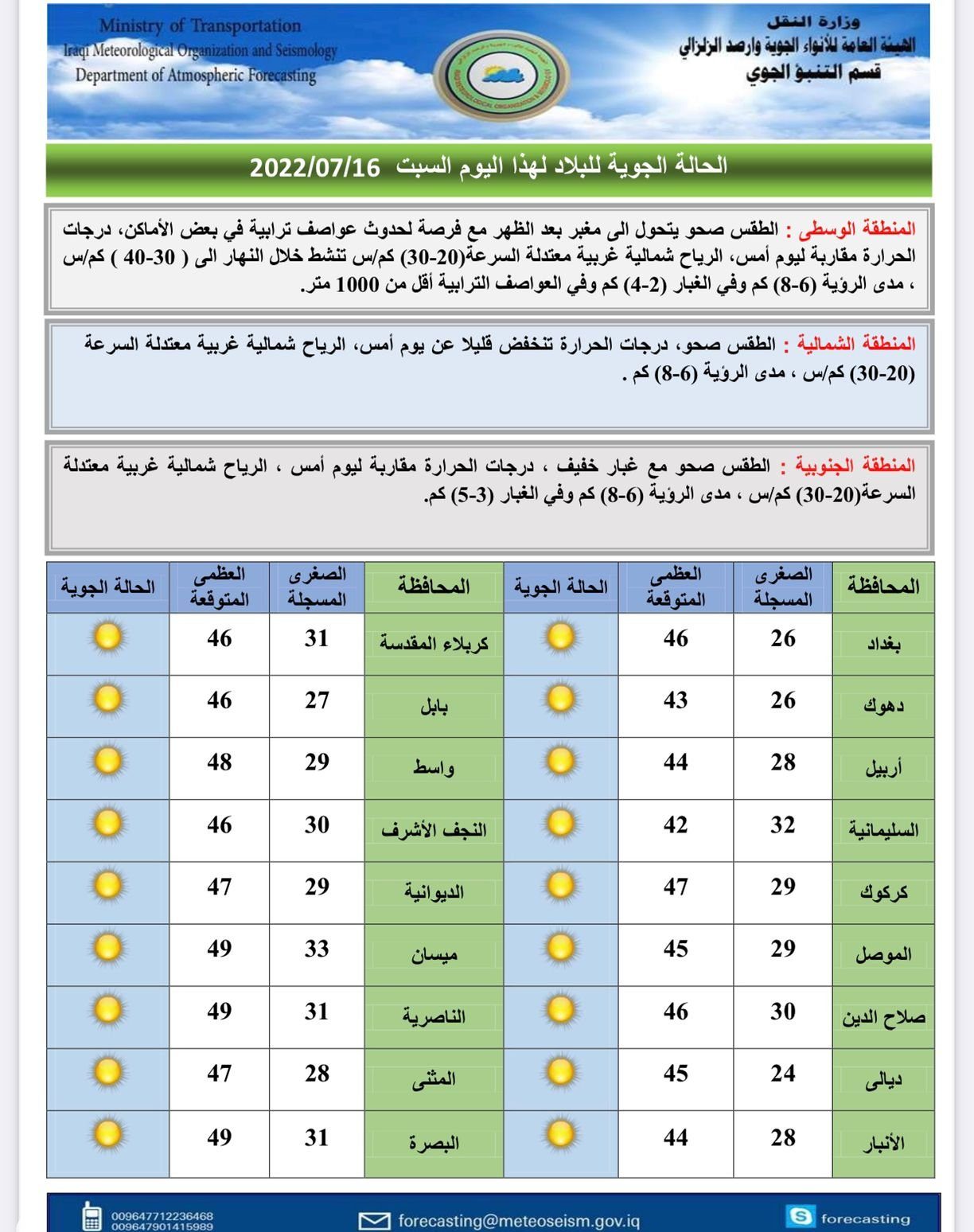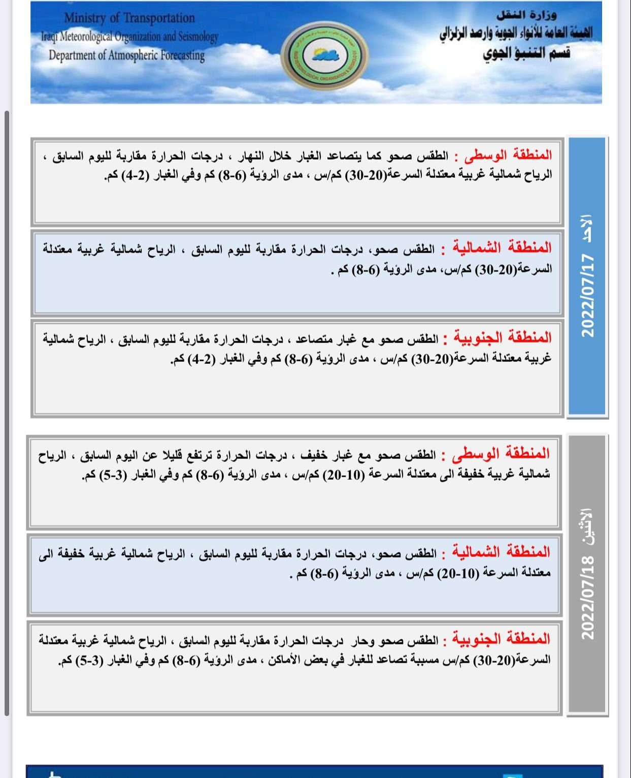 وأكدت الهيئة، في بيان تلقت “النعيم نيوز” نسخة منه، أن “الطقس في المنطقة الوسطى، سيكون صحو يتحول إلى مغبر بعد الظهر، مع فرصة لحدوث عواصف ترابية في بعض الأماكن، أما درجات الحرارة مقاربة ليوم أمس”.