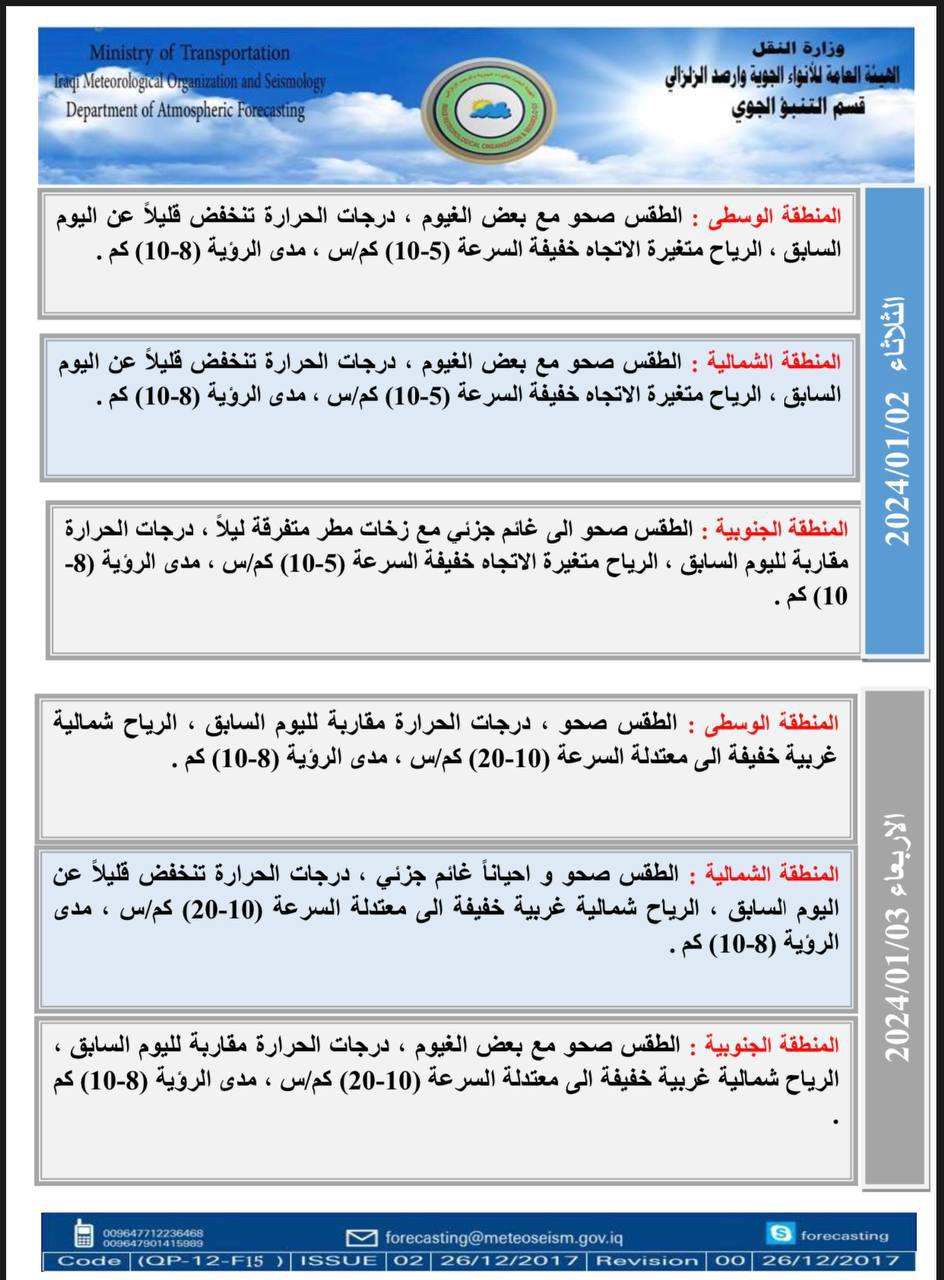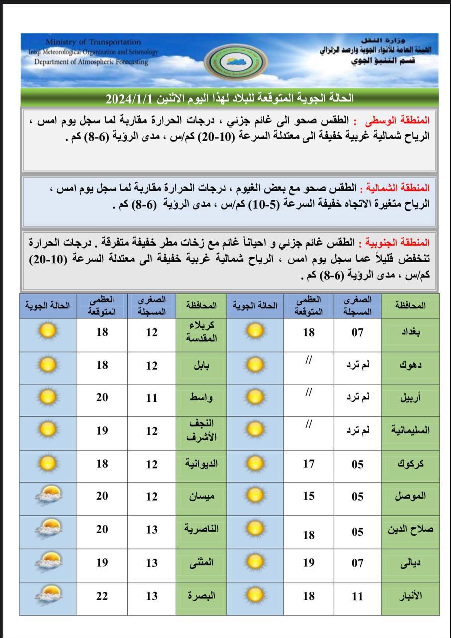 وتابع، أن “يوم الأربعاء، الطقس صحو في المنطقة الوسطى، وصحو وأحياناً غائم جزئي في المنطقة الشمالية. وصحو وأحياناً غائم جزئي في المنطقة الجنوبية، درجات الحرارة مقاربة لليوم السابق. في المنطقتين الوسطى والجنوبية، وستنخفض درجات الحرارة قليلاً. في المنطقة الشمالية”.