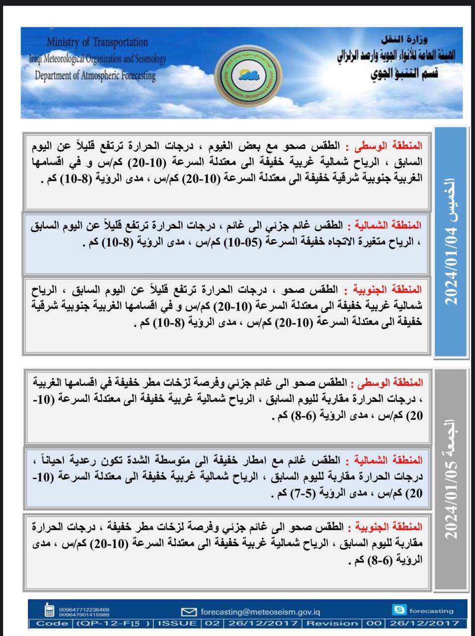 وأشار البيان، إلى أن “الخميس القادم، الطقس صحو مع بعض الغيوم في المنطقة الوسطى. وغائم جزئي إلى غائم في المنطقة الشمالية، وصحو في المنطقة الجنوبية، درجات الحرارة. ترتفع قليلاً عن اليوم السابق في جميع مناطق البلاد”.
