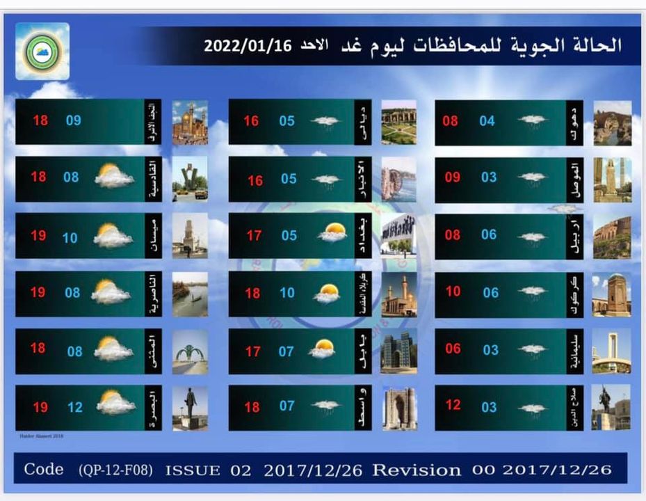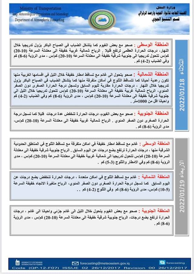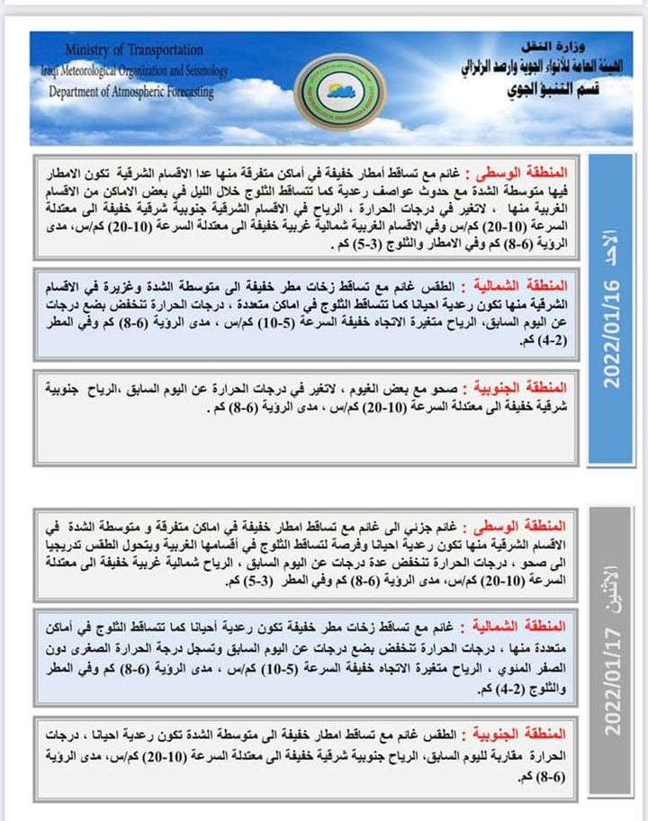 وتابعت، “فيما سيكون الطقس في المنطقة الشمالية غائم مع تساقط زخات مطر خفيفة إلى متوسطة الشدة ورعدية أحياناً. وسيكون الطقس صحو مع بعض الغيوم، أما درجات الحرارة ستنخفض بضع درجات عن اليوم السابق في جميع أنحاء البلاد”.