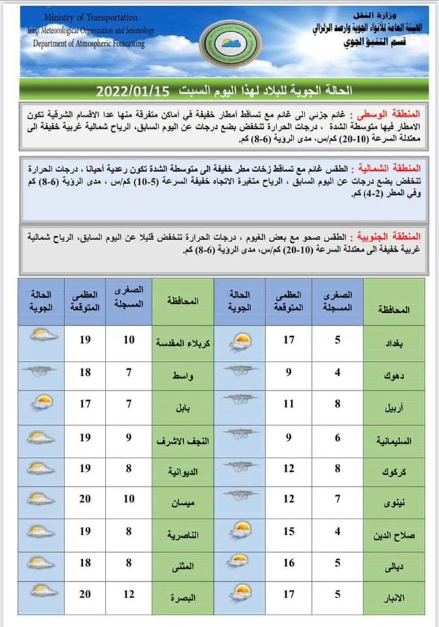 وأكدت الهيئة، في بيان تلقت “النعيم نيوز” نسخة منه، أن “طقس اليوم السبت في المنطقة الوسطى غائم جزئي إلى غائم مع تساقط أمطار خفيفة في أماكن متفرقة منها، عدا الاقسام الشرقية تكون الأمطار فيها متوسطة الشدة”.