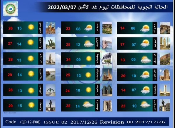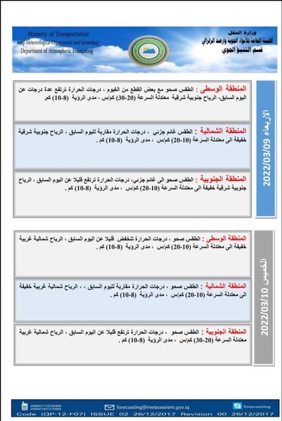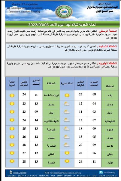 أعلنت الهيئة العامة للأنواء الجوية، اليوم الأحد، عن حالة الطقس في البلاد، خلال الأيام الأربعة المقبلة.