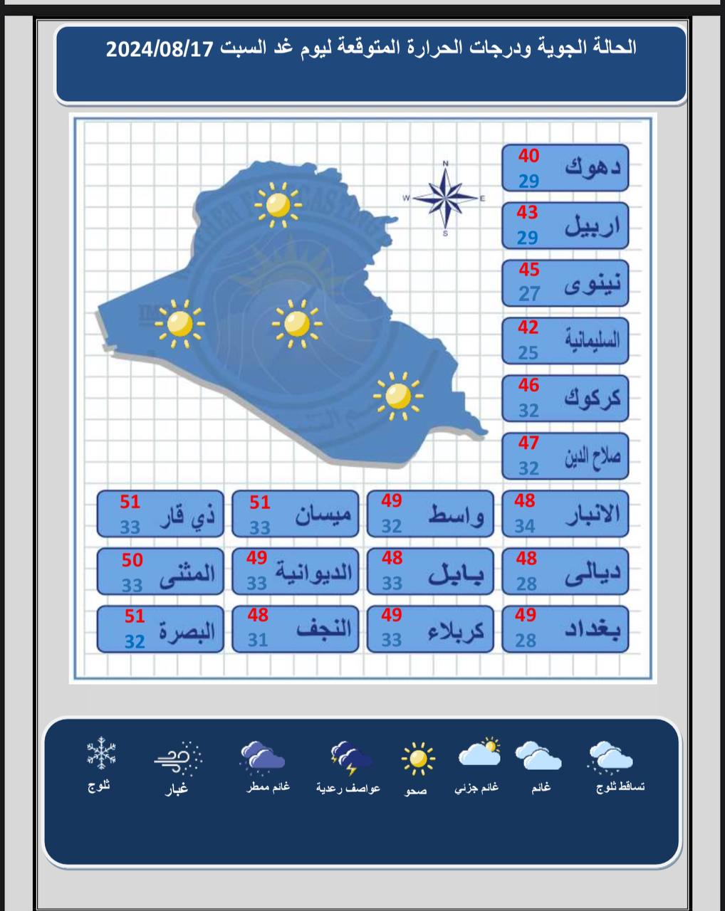 وأفاد بيان للهيئة، تلقت “النعيم نيوز” نسخة منه، بأن “الطقس ليوم غد السبت سيكون صحواً وحاراً، ودرجات الحرارة مقاربة لليوم السابق في عموم البلاد”، مبيّناً أن “درجات الحرارة العظمى في بغداد وكربلاء والديوانية وواسط 49، فيما ستسجل محافظات البصرة وميسان وذي قار 51 درجة مئوية”.