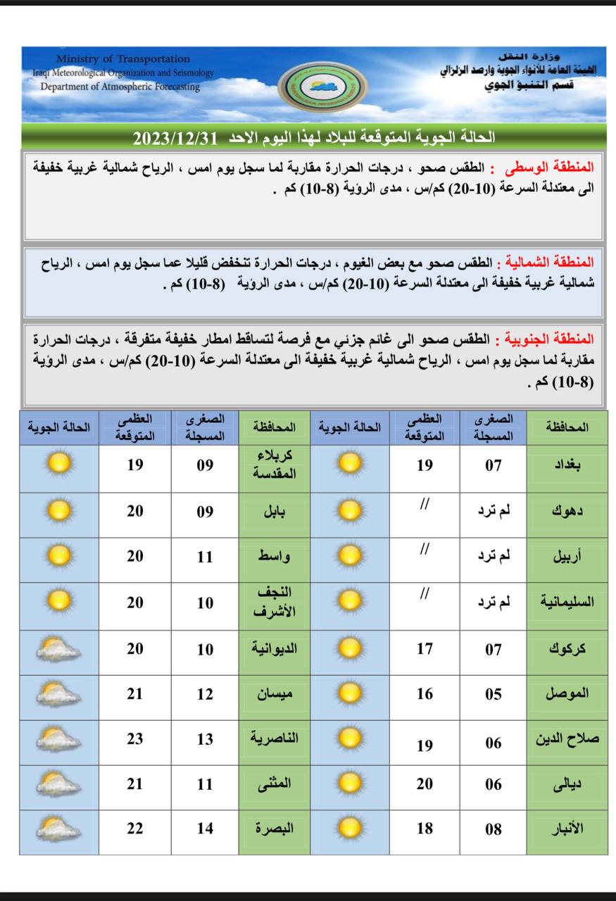 وأشار البيان، إلى أن “طقس الثلاثاء سيكون في المنطقتين الوسطى والشمالية. صحواً إلى غائم جزئياً، ودرجات الحرارة تنخفض قليلاً عن اليوم السابق في الشمال. وفي المنطقة الجنوبية سيكون الطقس صحواً مع بعض الغيوم. ودرجات الحرارة مقاربة لليوم السابق”.