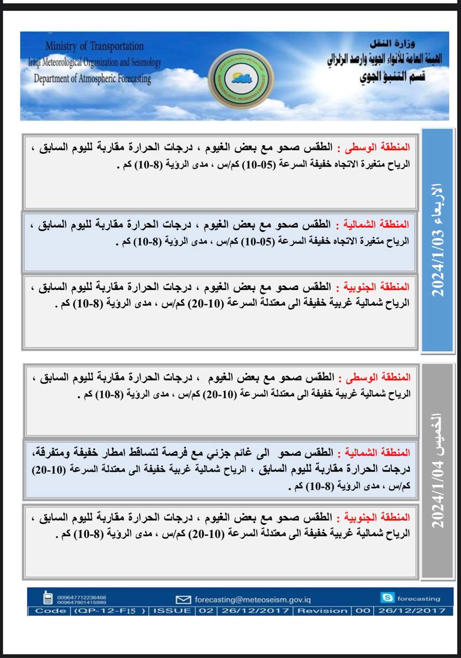ولفت، إلى أن “طقس الأربعاء سيكون في عموم مناطق البلاد صحواً مع بعض الغيوم. ودرجات الحرارة مقاربة لليوم السابق، بينما سيكون طقس الخميس المقبل في المنطقتين الوسطى والجنوبية صحواً مع بعض الغيوم. ودرجات الحرارة مقاربة لليوم السابق”، موضحاً أنه “وفي المنطقة الشمالية سيكون الطقس صحواً إلى غائم جزئياً. مع فرصة لتساقط أمطار خفيفة، ومتفرقة ودرجات الحرارة مقاربة لليوم السابق”.