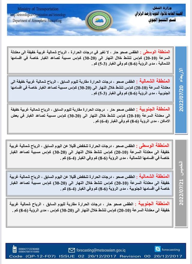 أعلنت الهيئة العامة للأنواء الجوية، اليوم الثلاثاء، عن حالة الطقس في البلاد خلال الأيام المقبلة، فيما توقعت تصاعداً للغبار مع انخفاض في درجات الحرارة.