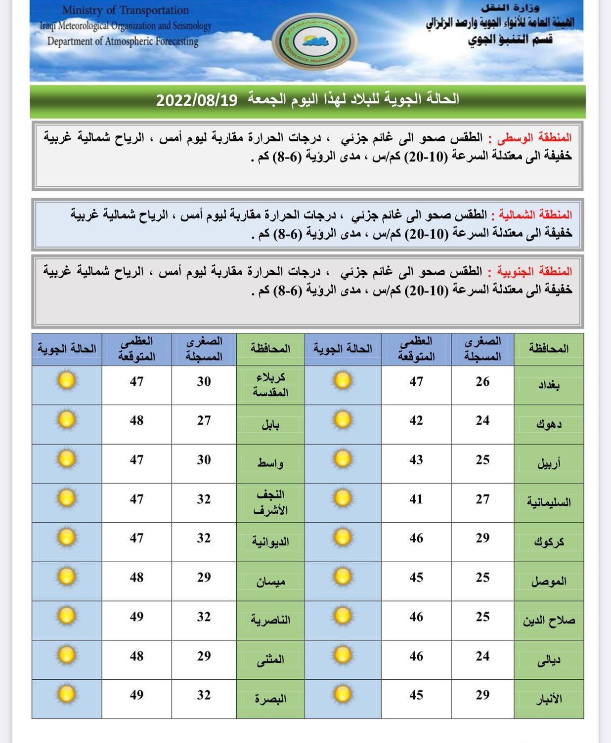 وأضاف، أن “طقس يوم الأحد سيكون صحواً إلى غائماً جزئياً، وفي أقسامها الغربية يكون مغبراً في المنطقة الوسطى. بينما سيكون الطقس في المنطقتين الشمالية والجنوبية صحواً إلى غائماً جزئياً، ودرجات الحرارة ستكون مقاربة لليوم السابق في عموم البلاد”.