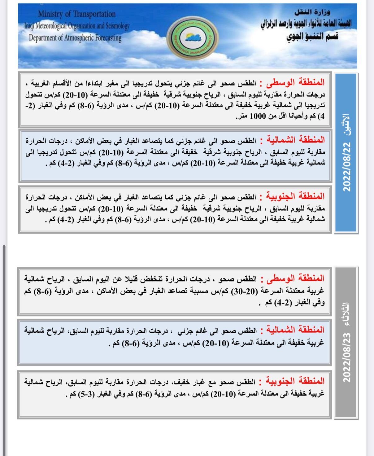 وأشار البيان، إلى أن “طقس يوم الاثنين في المنطقة الوسطى سيكون صحواً إلى غائماً جزئياً. ويتحول تدريجياً إلى مغبر ابتداءً من الأقسام الغربية. بينما سيكون طقس المنطقتين الشمالية والجنوبية صحواً إلى غائماً جزئياً كما يتصاعد الغبار في بعض الأماكن. أما درجات الحرارة ستكون مقاربة لليوم السابق في عموم البلاد”.