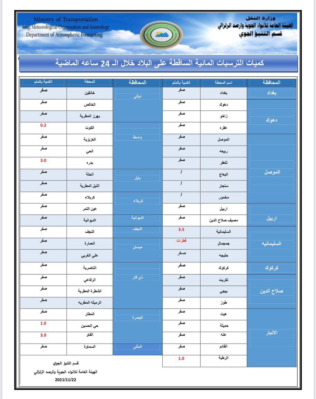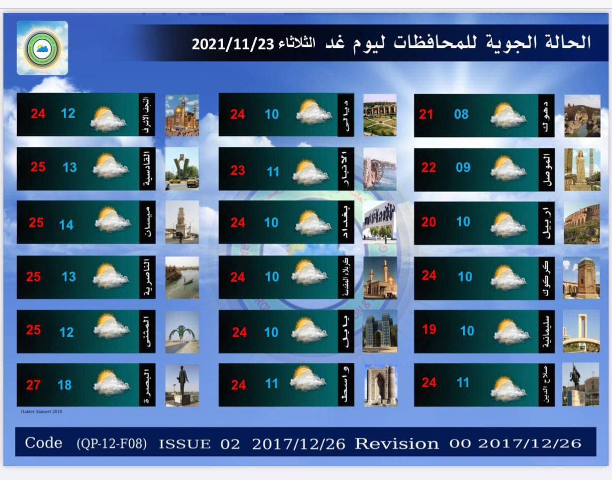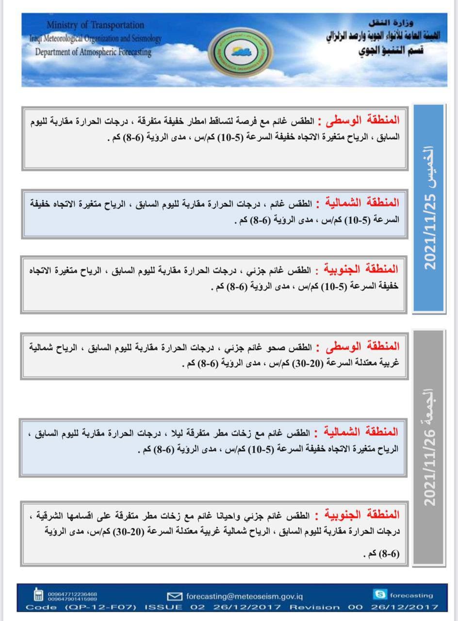 وأوضح أن “يوم الاربعاء سيكون الطقس غائماً جزئياً واحياناً يكون غائماً مع تساقط زخات مطر خفيفة في اماكن متفرقة تكون رعدية احيانا في المنطقة الوسطى. وسيكون الطقس غائماً جزئياً واحيانا يكون غائماً في المنطقة الشمالية. وغائماً جزئياً في المنطقة الجنوبية. وسترتفع درجات الحرارة قليلاً في عموم البلاد”.