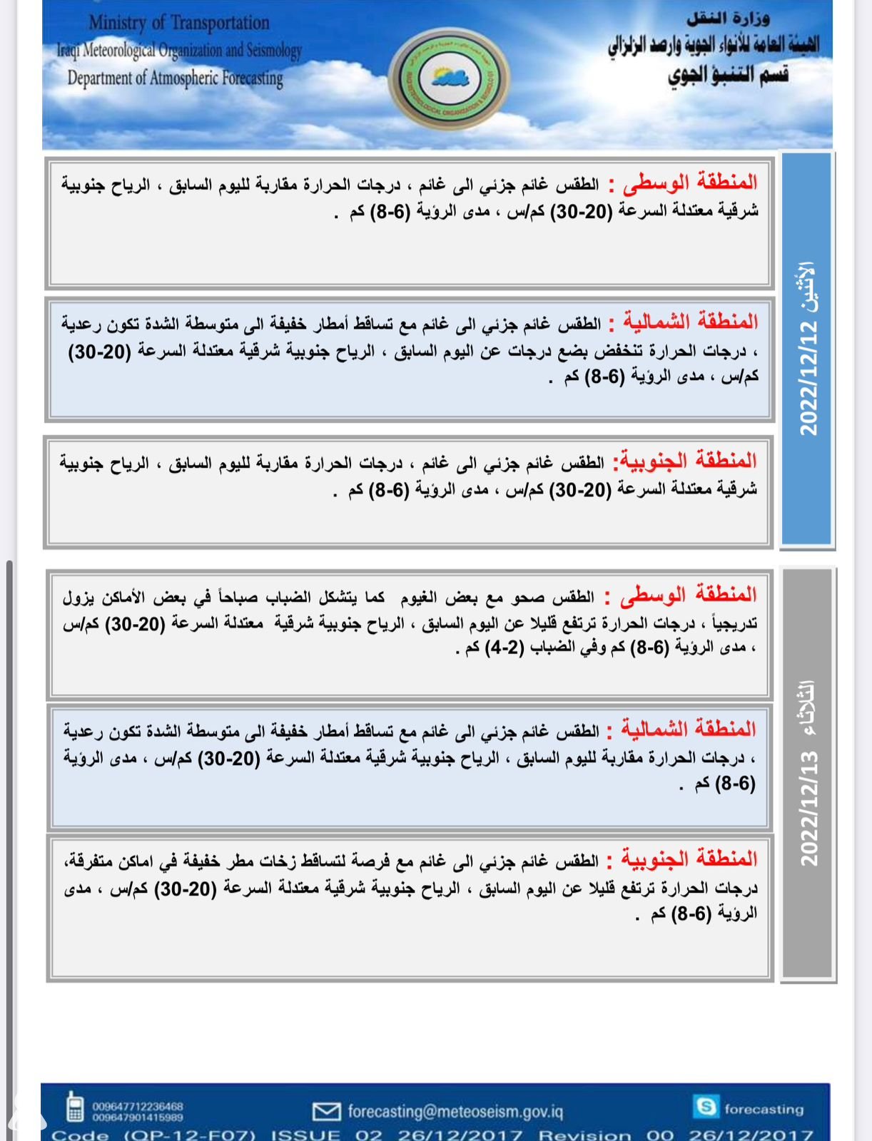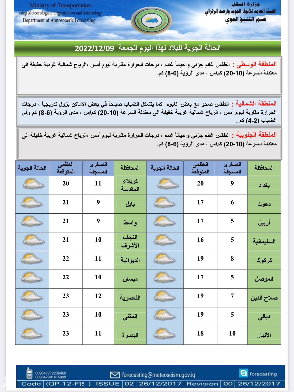 وأشار الى، أن “طقس البلاد ليوم الثلاثاء المقبل سيكون صحواً مع بعض الغيوم كما يتشكل الضباب صباحاً في بعض الاماكن يزول تدريجياً، بينما سيكون طقس المنطقة الشمالية غائماً جزئياً الى غائم مع تساقط امطار خفيفة الى متوسطة الشدة وتكون رعدية ،ودرجات الحرارة ستكون مقاربة،، فيما سيكون الطقس في المنطقة الجنوبية غائماً جزئياً الى غائم مع فرصة تساقط امطار خفيفة في اماكن متفرقة ،أما درجات الحرارة فسترتفع قليلاً عن اليوم السابق في الاقسام الوسطى والجنوبية“.