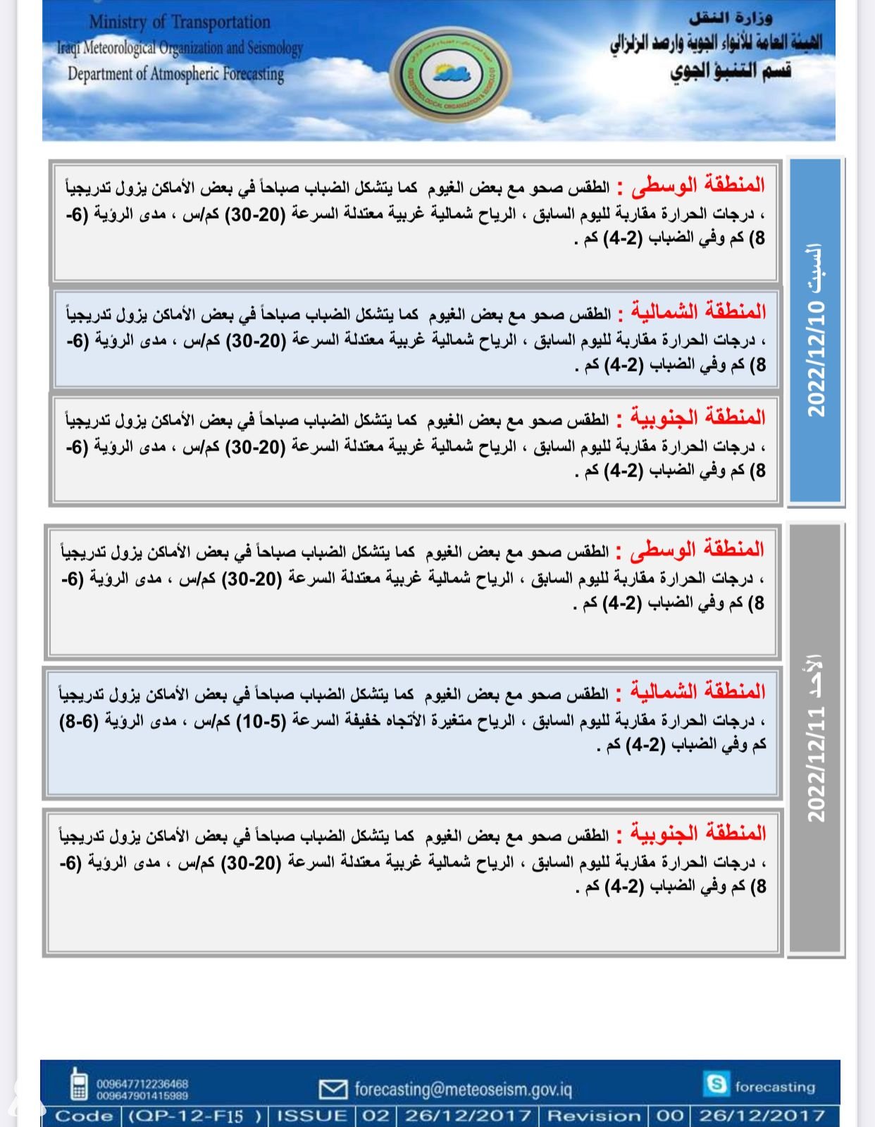 وأضاف البيان، أن “طقس يوم الاحد سيكون صحواً مع بعض الغيوم، كما يتشكل الضباب صباحاً في بعض الاماكن يزول تدريجياً في عموم البلاد، اما درجات الحرارة ستكون مقاربة لليوم السابق في جميع مناطق البلاد“.