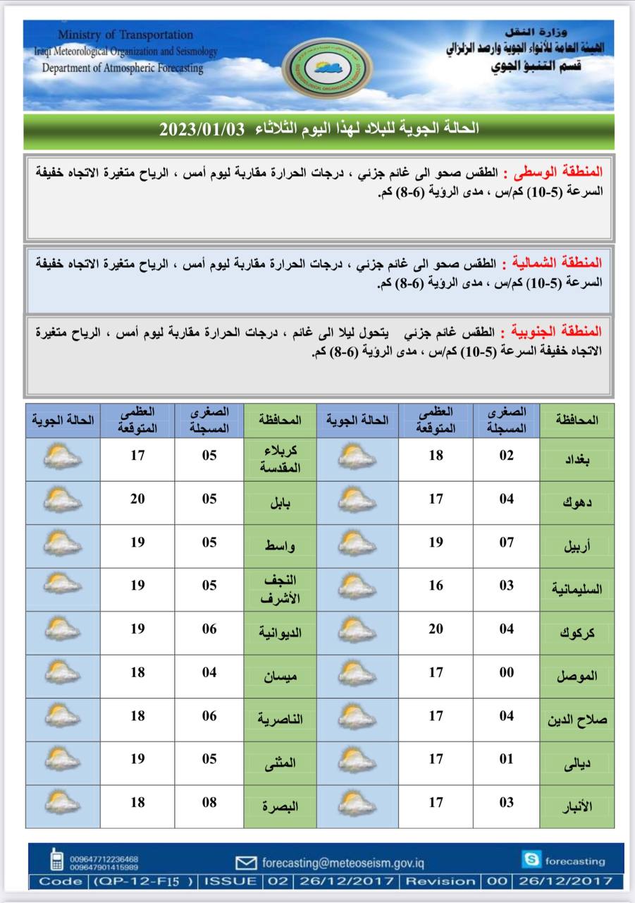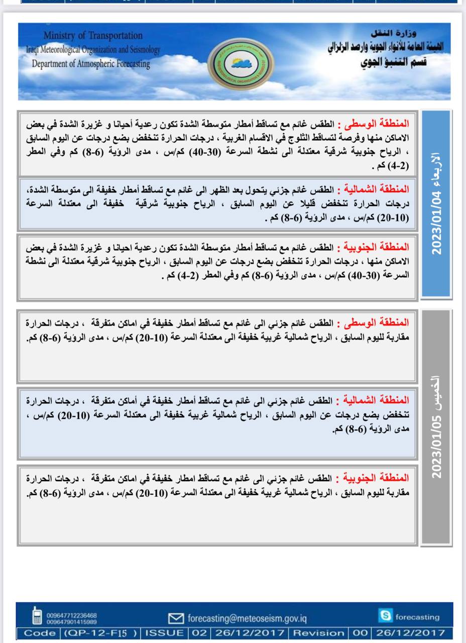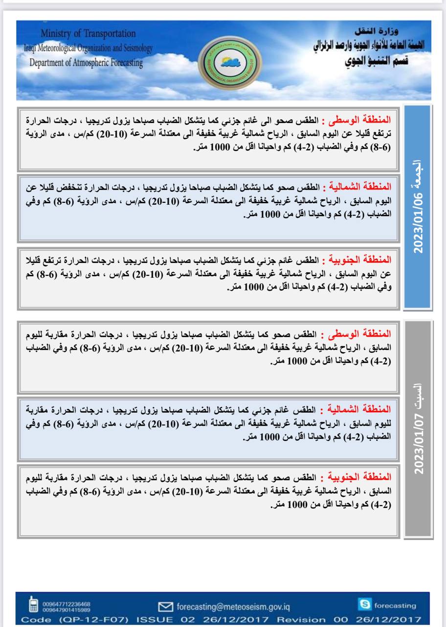 أعلنت هيئة الأنواء الجوية، اليوم الثلاثاء، عن حالة الطقس في البلاد للأيام المقبلة، فيما توقعت ارتفاعاً في درجات الحرارة بدءاً من الجمعة.