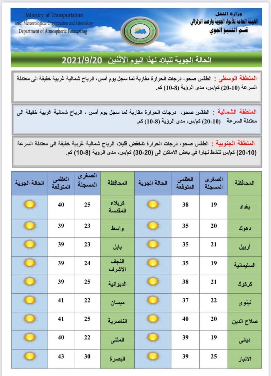 كما أوضح، ان “الطقس ليوم الاربعاء سيكون صحواً ودرجات الحرارة مقاربة لليوم السابق”. مشيراً إلى أن “الرياح في المنطقة الوسطى. والشمالية، ستكون شمالية غربية خفيفة الى معتدلة السرعة (10-20) كم/س، مدى الرؤية (8-10) كم. كما تنشط نهاراً في بعض الاماكن من المنطقة الجنوبية الى (20-30)كم/س، ومدى الرؤية (8-10) كم”.