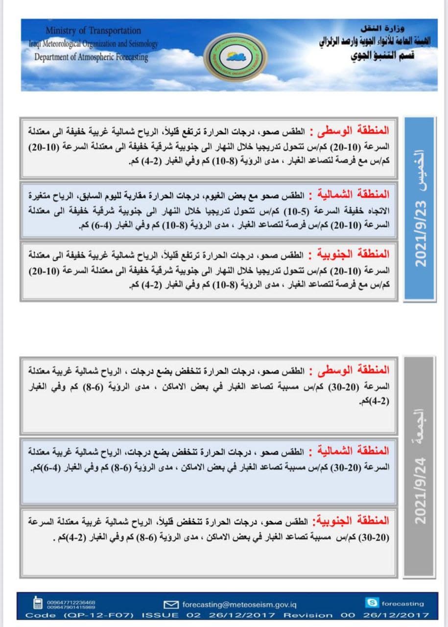 بينما أضاف، أن “الطقس ليوم الخميس سيكون صحواً، ودرجات الحرارة ترتفع قليلاً في الأقسام الوسطى والجنوبية. أما الرياح ستكون شمالية غربية خفيفة الى معتدلة السرعة (10-20) كم/س، تتحول تدريجيا خلال النهار إلى جنوبية شرقية الى معتدلة السرعة (10-20)كم/س مع فرصة لتصاعد الغبار ومدى الرؤية (8-10) كم وفي الغبار(2-4)كم. أما في المنطقة الشمالية سيكون الطقس صحواً مع بعض الغيوم ودرجة الحرارة مقاربة لليوم السابق. وستكون الرياح متغيرة الاتجاة خفيفة السرعة (5-10) كم/س تتحول تدريجيا خلال النهار الى جنوب شرقية خفيفة إلى معتدلة السرعة (10-20)كم /س مع فرصة لتصاعد الغبار. ومدى الرؤية (8-10) كم وفي الغبار (2-4)كم”.
