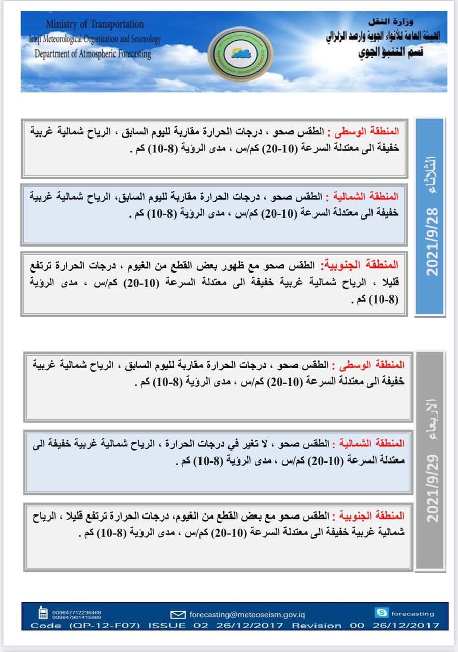 وأوضح، أن “طقس يوم الأربعاء سيكون صحواً ودرجات الحرارة مقاربة لليوم السابق في المنطقة الوسطى ولاتغير فيها بالقسم الشمالي. أما في المنطقة الجنوبية سيكون الطقس فيها صحواً مصحوبا لبعض الغيوم وارتفاع قليل بدرجات الحرارة. في حين ان الرياح ستكون شمالية غربية خفيفة الى معتدلة السرعة (10-20) كم/س في عموم البلاد”.