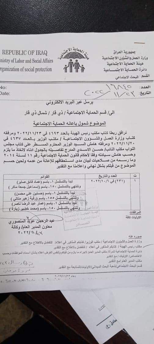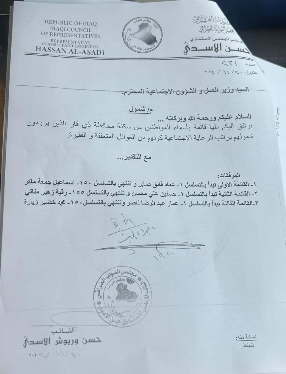 استحصل النائب حسن الاسدي، اليوم الخميس، موافقة معالي وزير العمل والشؤون الاجتماعية على شمول العديد من ابناء مناطق جنوب ذي قار بالرعاية الاجتماعية.