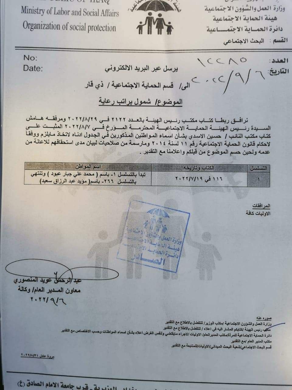 كما استحصل السيد النائب موافقة سابقة لادراج ٢٦٦ عائلة ضمن برنامج الرعاية الاجتماعية في قضاء الجبايش وتم اكمال ادراجهم وبانتظار استلامهم الكي كارد الخاص بهم، شكرنا وتقديرنا الغالي لمعالي وزير العمل والشؤون الاجتماعية على تعاونه من إنصاف العوائل الفقيرة والمحرومة في هذه المناطق”.
