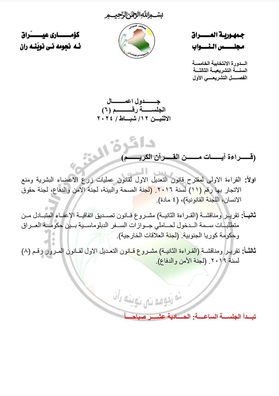 أعلن البرلمان، اليوم السبت، عن جدول أعمال جلسة الاثنين المقبل. وفيما يلي جدول الاعمال، وتلقت "النعيم نيوز" نسخة منه: