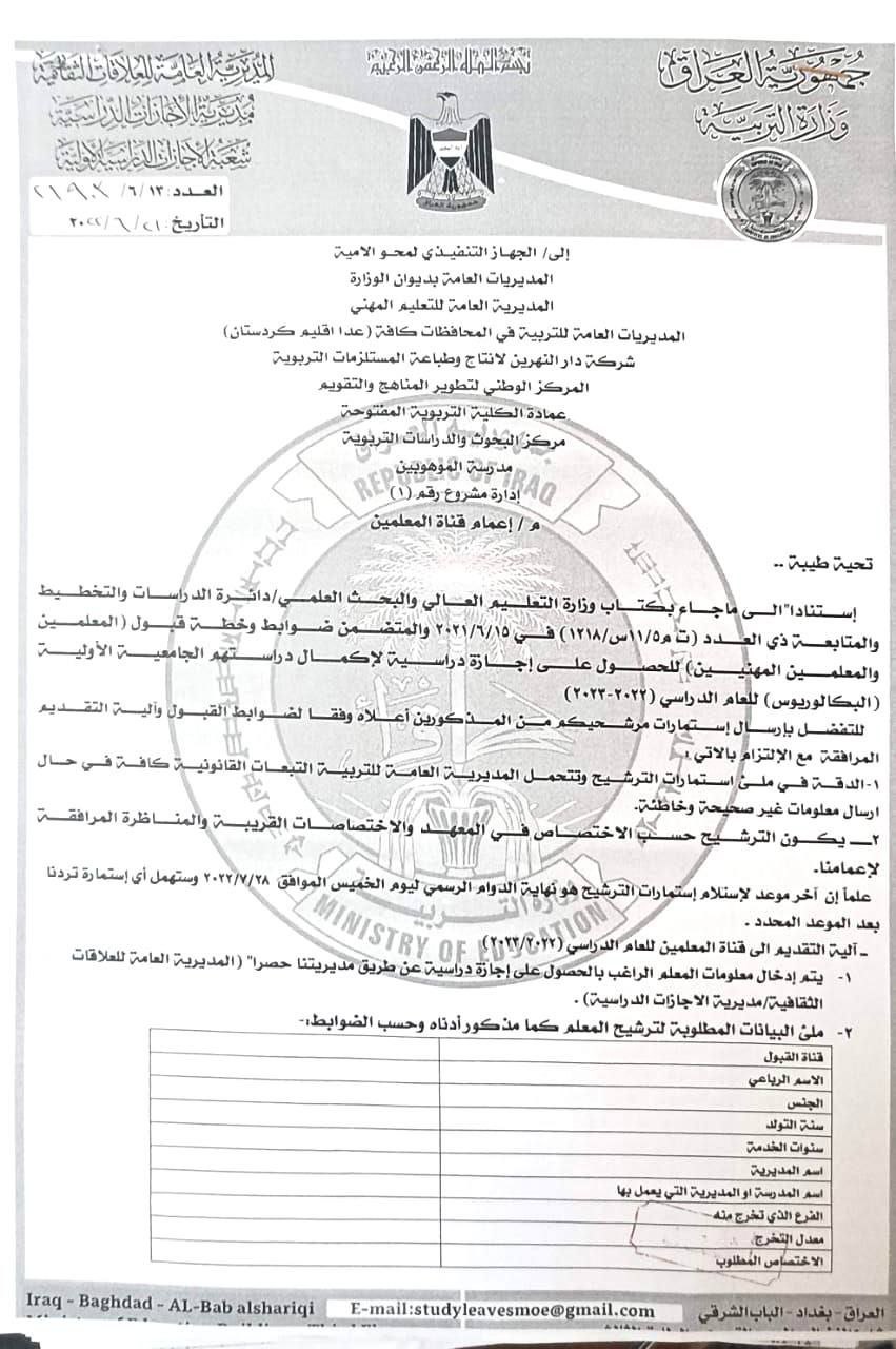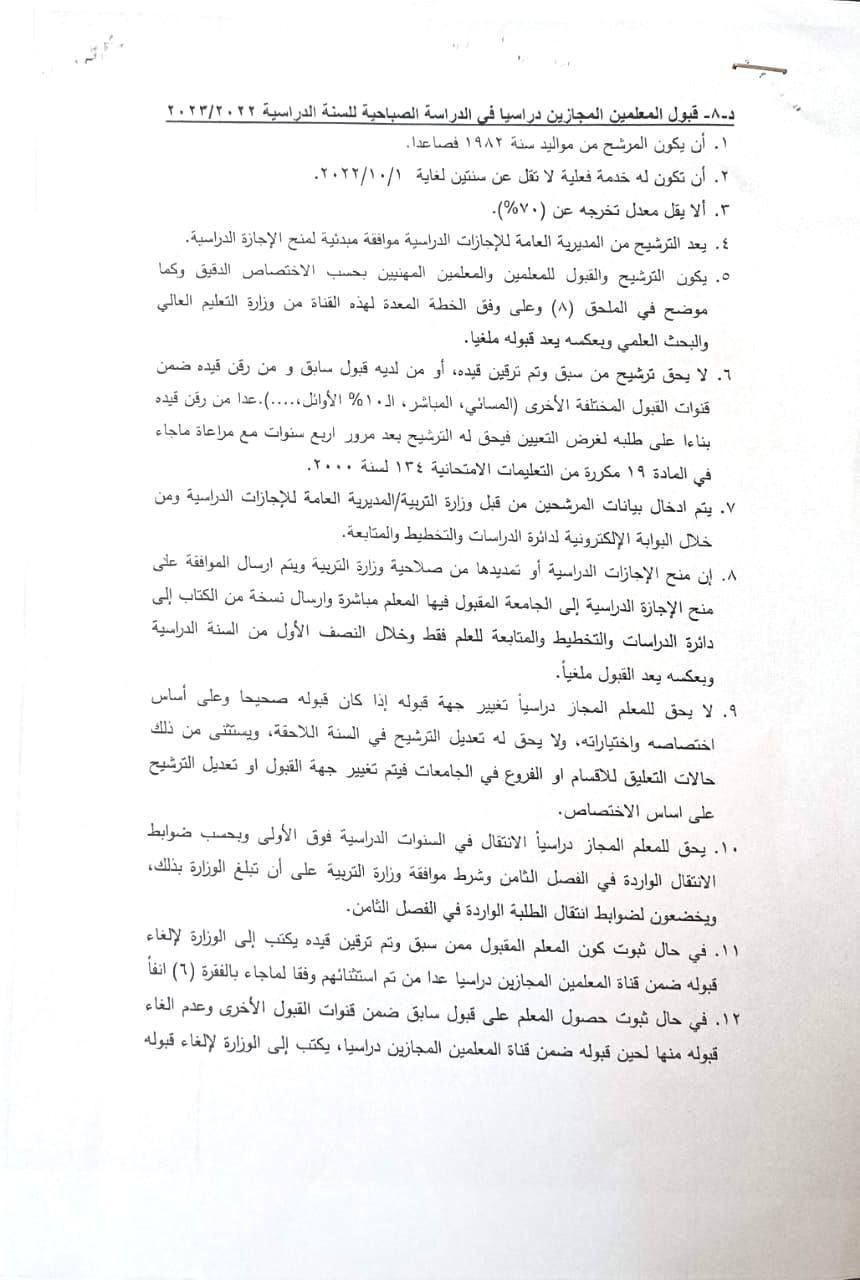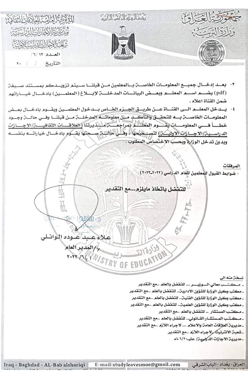 وأضافت الوزارة، أنه “وفي حالة وجود خطأ في المعلومات يقوم المعلم بمراجعة مديريتنا (العلاقات الثقافية / الاجازات الأولية) لتصحيحها، أما في حالة صحتها يقوم بإدخال خياراته بنفسه وبدون تدخل الوزارة، وبحسب الاختصاص المطلوب”.
