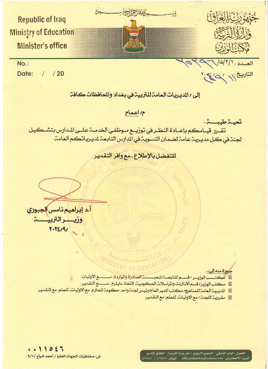 وأكمل: “وإعادة النظر بتنظيم الدوام الثلاثي والثنائي داخل المؤسسات التربوية، وتوزيع موظفي الخدمة على المدارس بتسوية عادلة وأحقية حسب حاجة المدرسة وأعداد الطلبة، عبر تشكيل لجان مختصة في المديريات”.