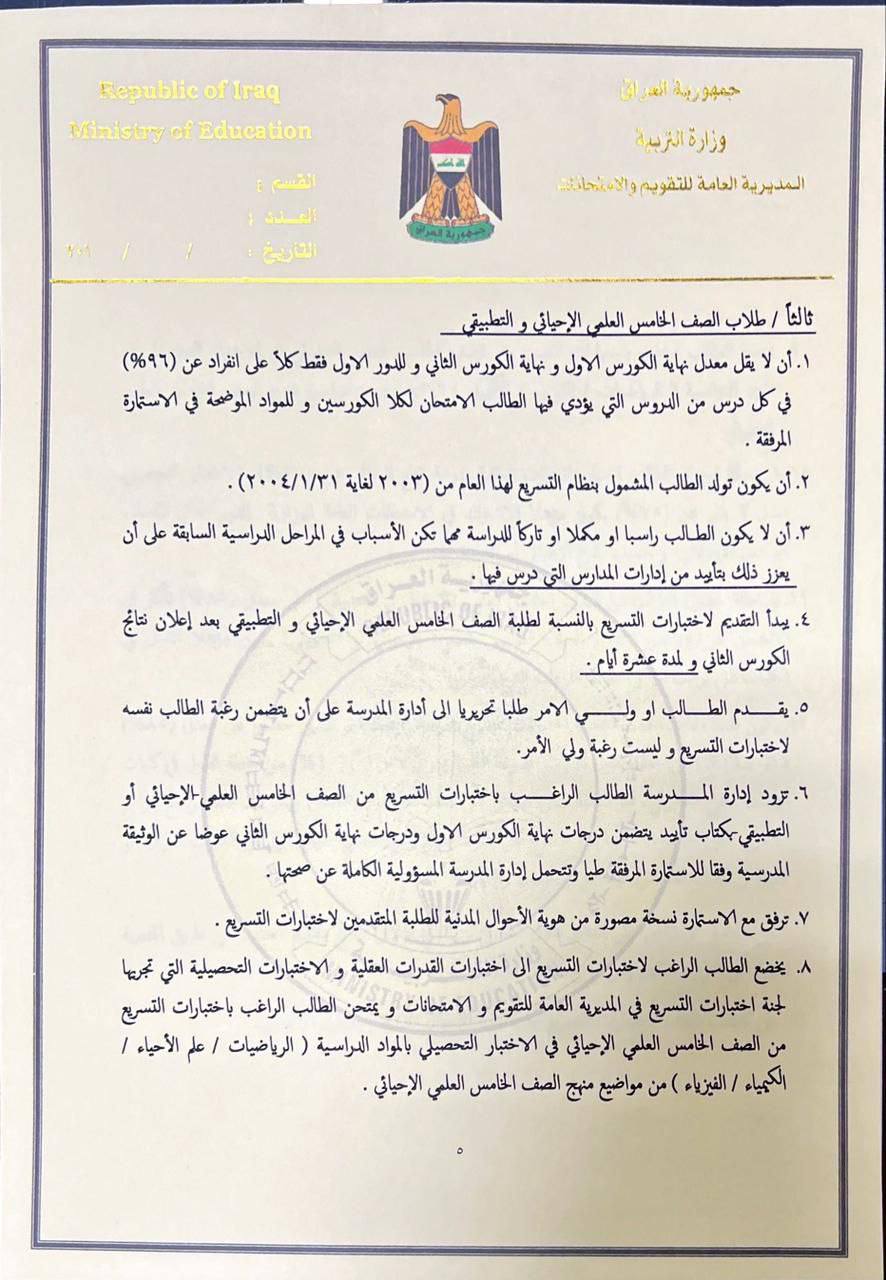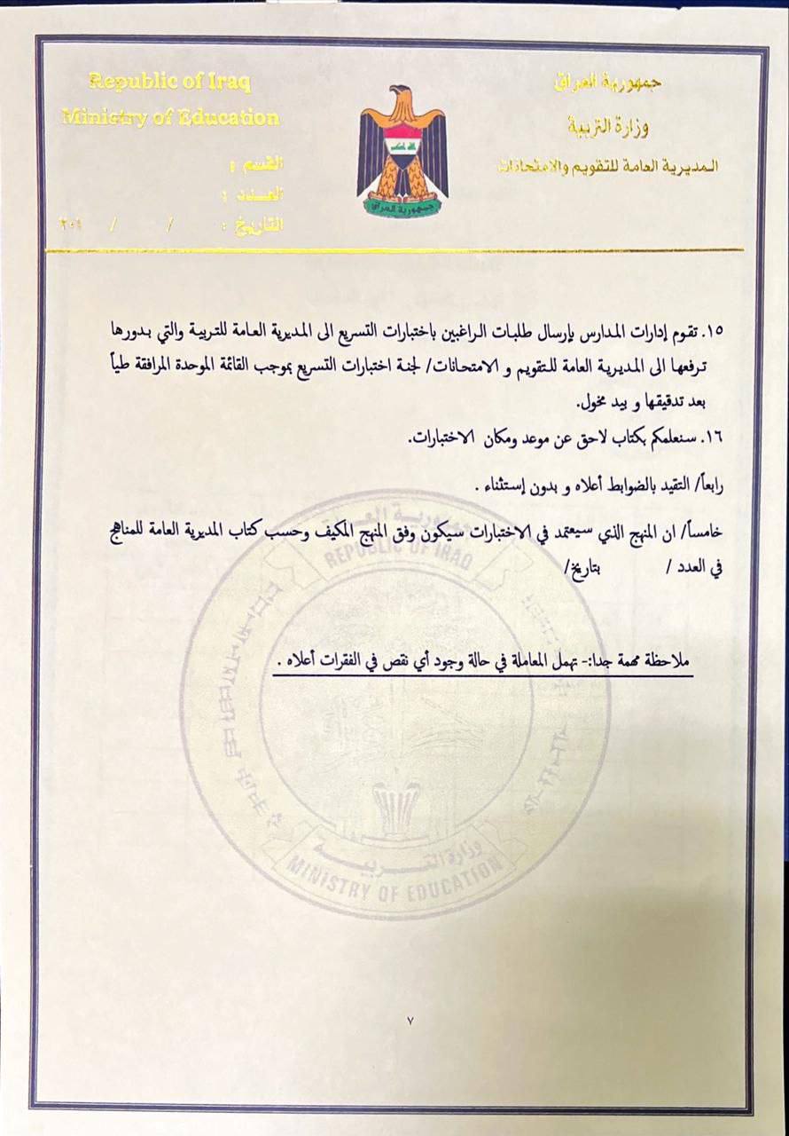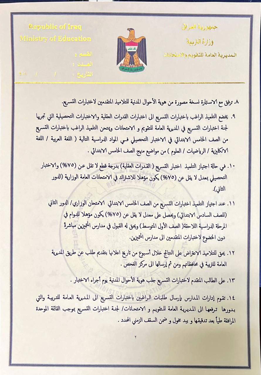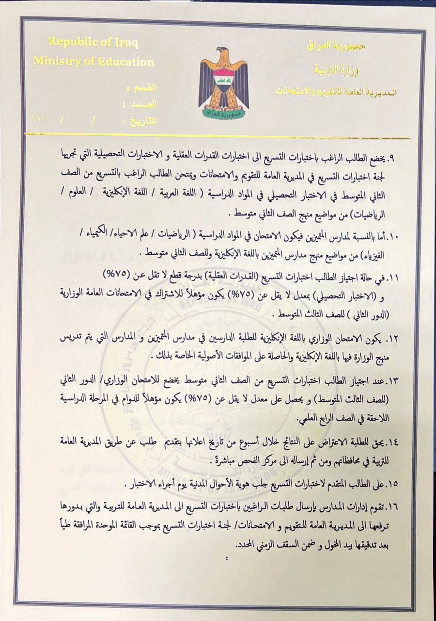 وقالت الوزارة في بيان تلقته “النعيم نيوز”. إن “اختبارات التسريع تشمل طلبة الصفوف التي تسبق المرحلة الوزارية وهم تلاميذ الصف الخامس الابتدائي وطلبة الثاني المتوسط والخامس الاعدادي”.