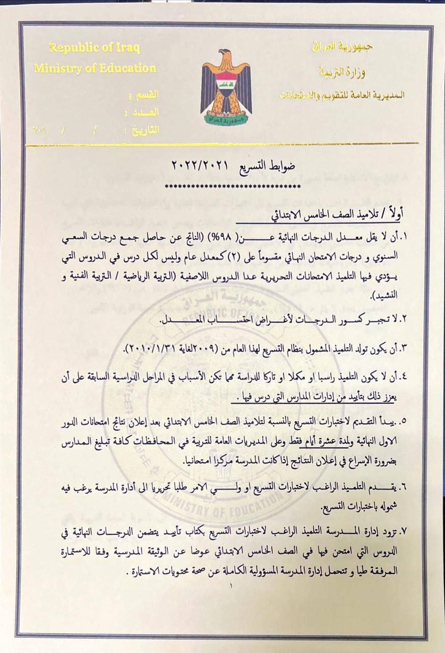 أصدرت وزارة التربية، اليوم الأربعاء، الضوابط الخاصة بالتلاميذ والطلبة الراغبين بالتسريع للعام الدراسي 2021 – 2022.